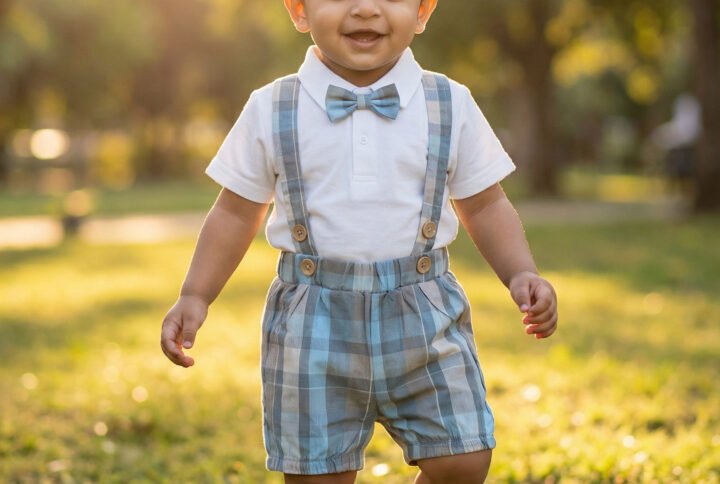 Dress your little one in timeless style with this adorable baby boys suspender romper set. Featuring a crisp white short-sleeve shirt paired with blue & white striped shorts with attached suspenders and a matching bow tie, this outfit is perfect for special occasions, birthday parties, weddings, or family photos.