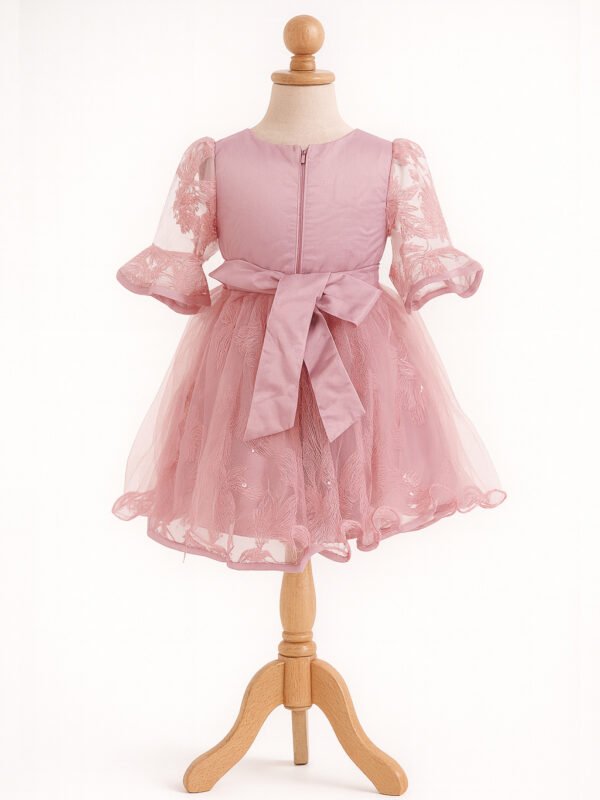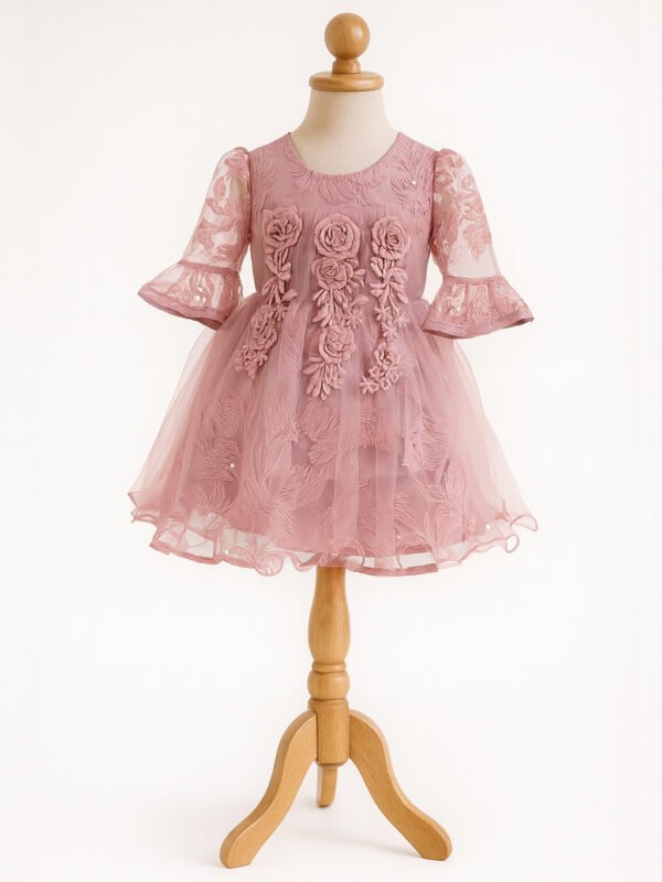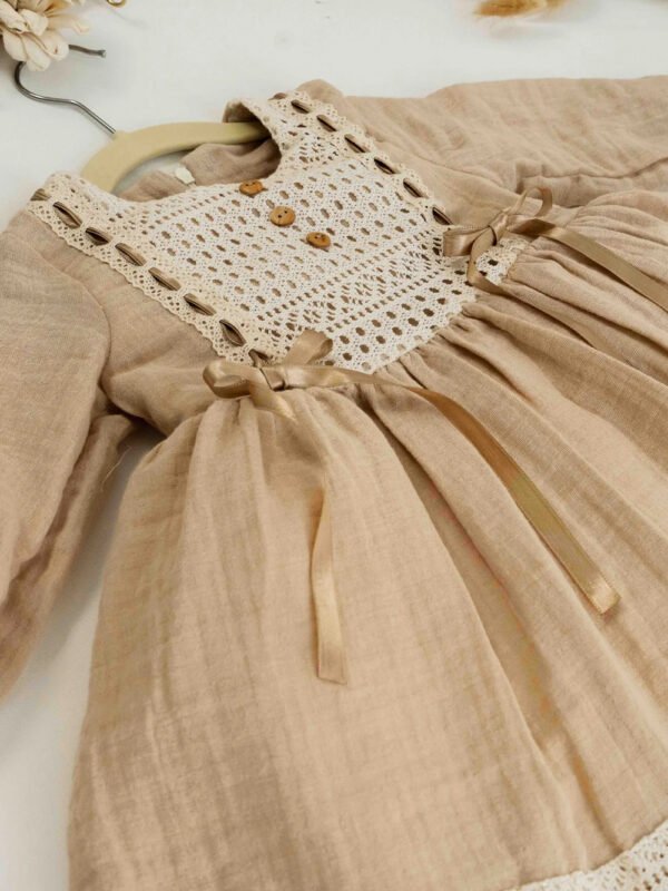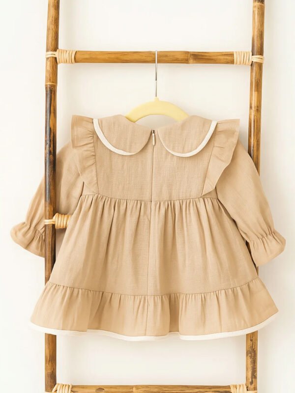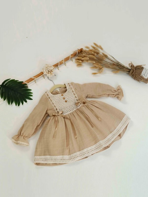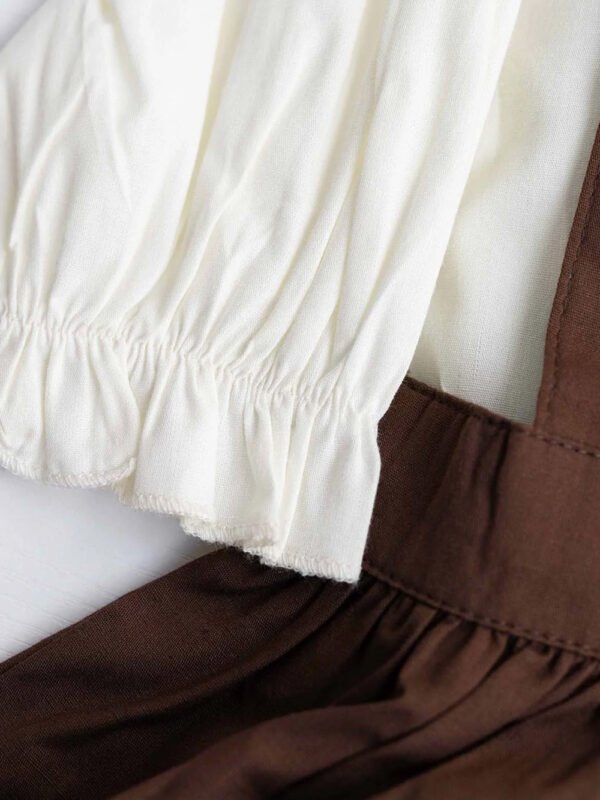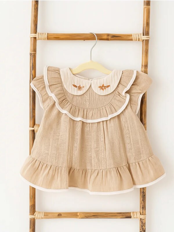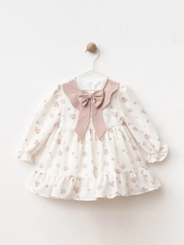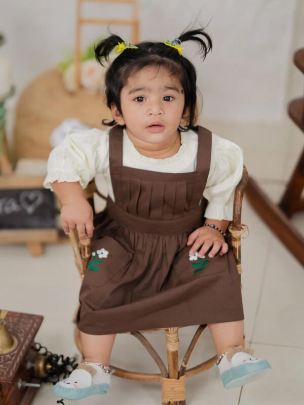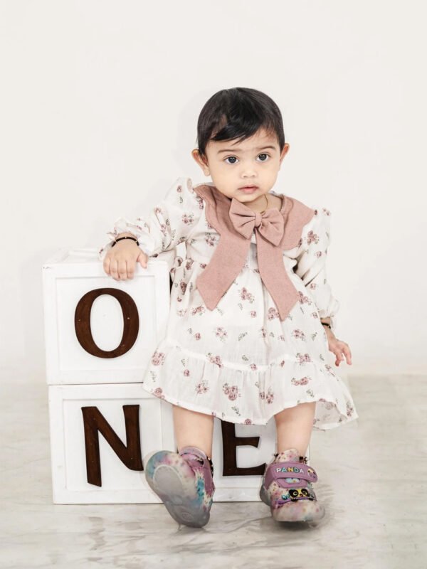 This charming baby outfit blends vintage elegance with modern comfort. The dress includes a soft floral-print blouse with a Peter Pan collar, delicate ruffled cuffs, and a dainty bow detail at the neckline. Paired with a stylish dusty pink suspender skirt with pleated details and buttoned straps, this ensemble is perfect for special occasions and everyday cuteness.