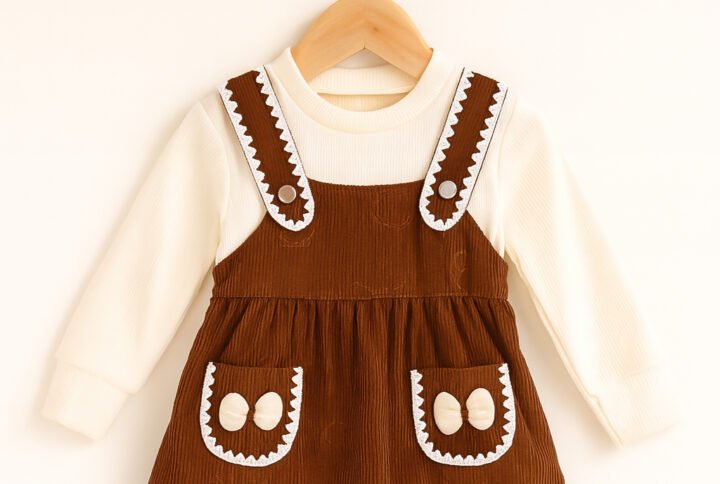 This charming baby outfit blends vintage elegance with modern comfort. The dress includes a soft floral-print blouse with a Peter Pan collar, delicate ruffled cuffs, and a dainty bow detail at the neckline. Paired with a stylish dusty pink suspender skirt with pleated details and buttoned straps, this ensemble is perfect for special occasions and everyday cuteness.