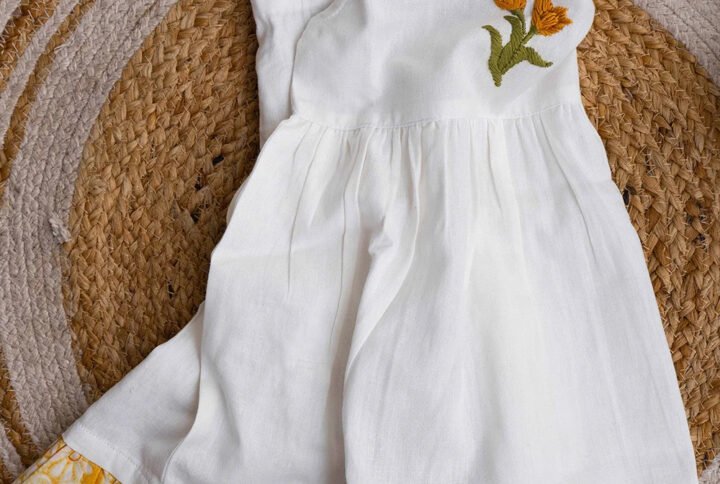This adorable baby girl dress blends timeless elegance with cozy comfort. Designed in a soft, textured fabric with intricate embroidery, it features a classic square bib collar adorned with delicate floral appliqués. The long sleeves are finished with charming bow-tied cuffs, making it perfect for special occasions and everyday wear