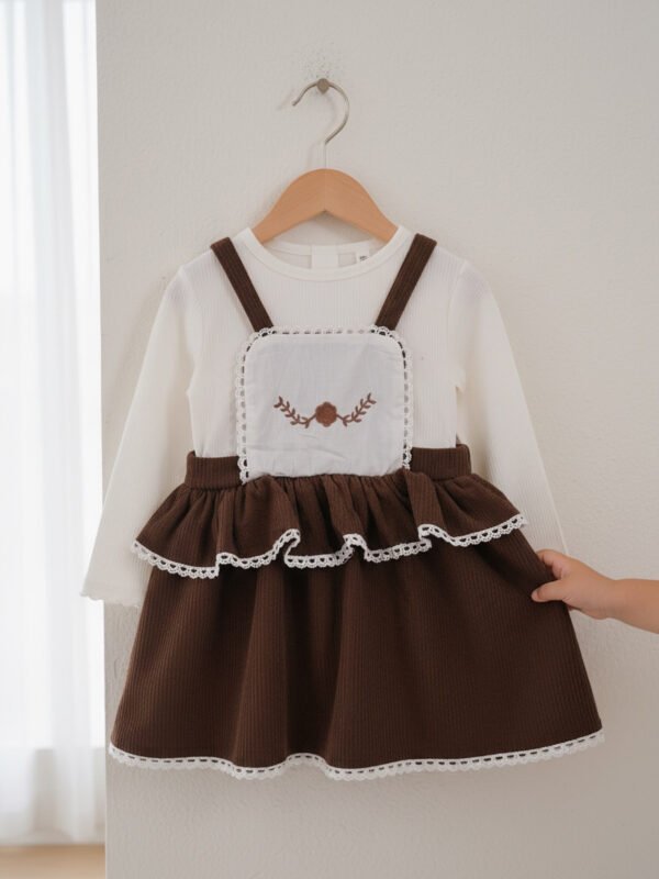 Baby Girls' Brown Corduroy Pinafore Dress with Floral Embroidery & Lace Trim
