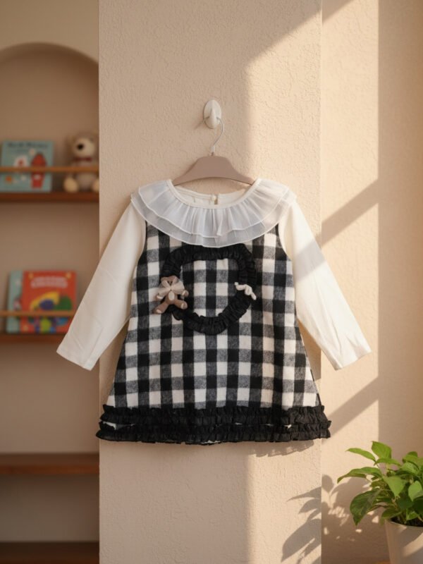 aby Girls' Black & White Gingham Fake Two-Piece Dress with Ruffled Collar
