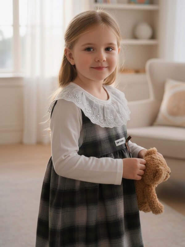 aby Girls' Black & White Gingham Fake Two-Piece Dress with Ruffled Collar