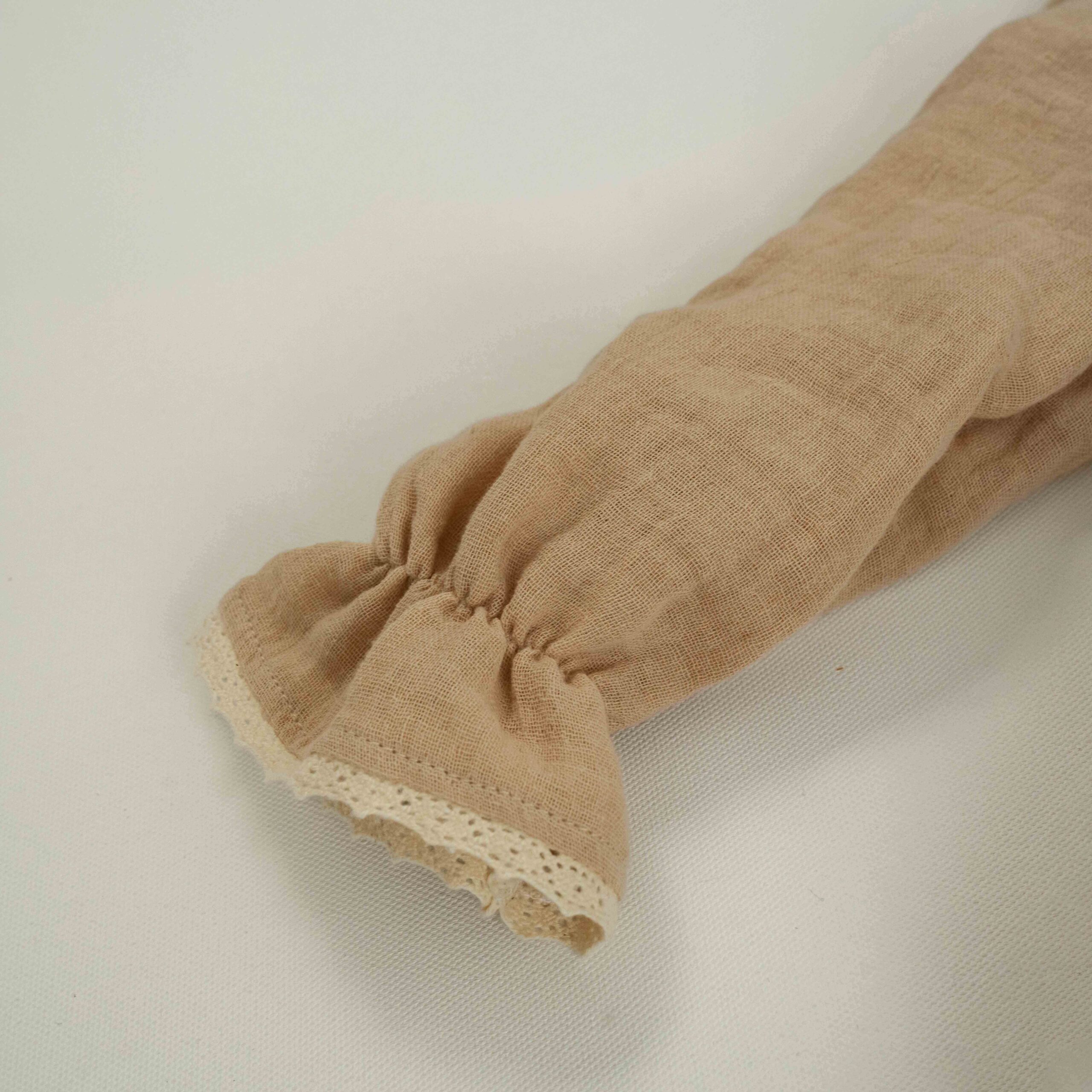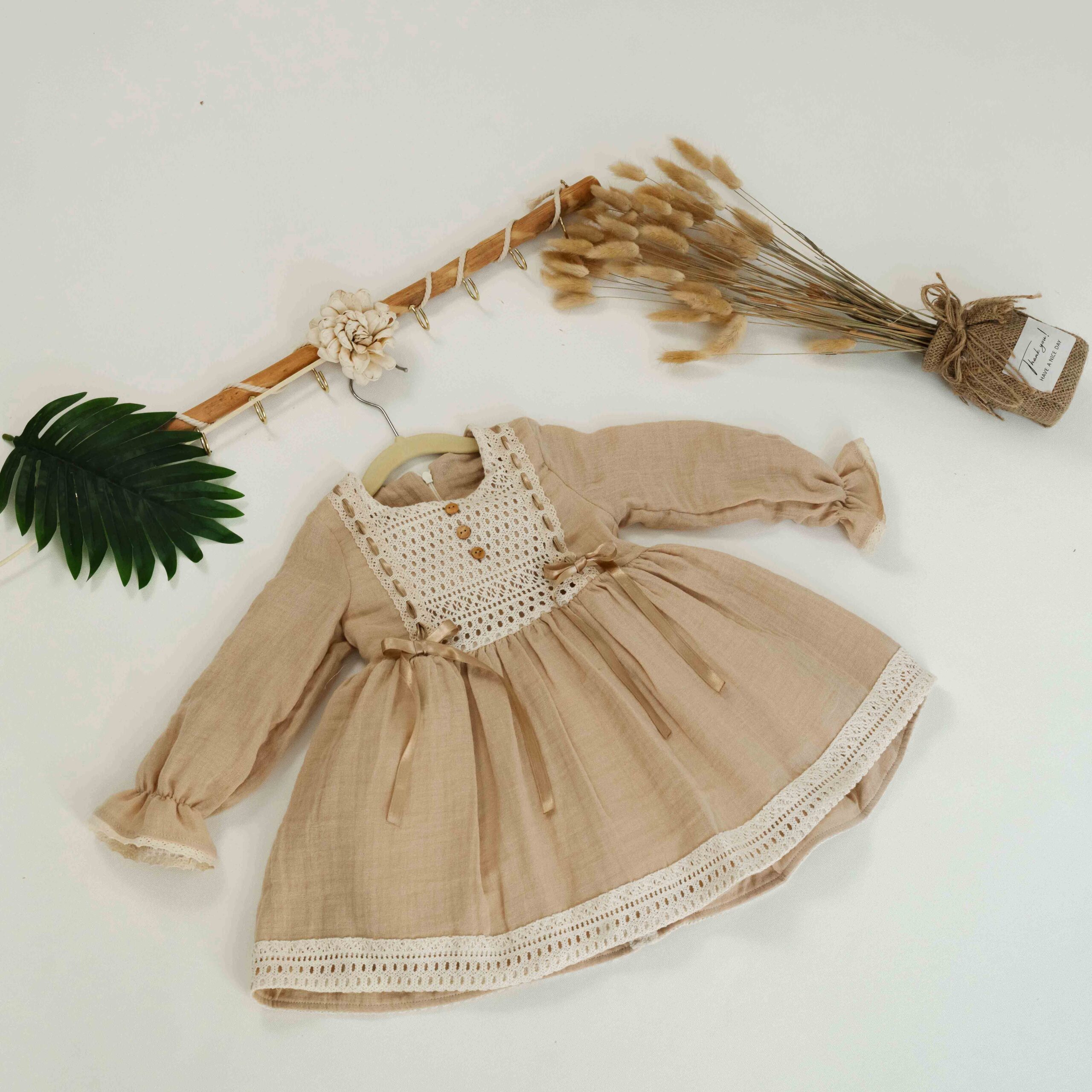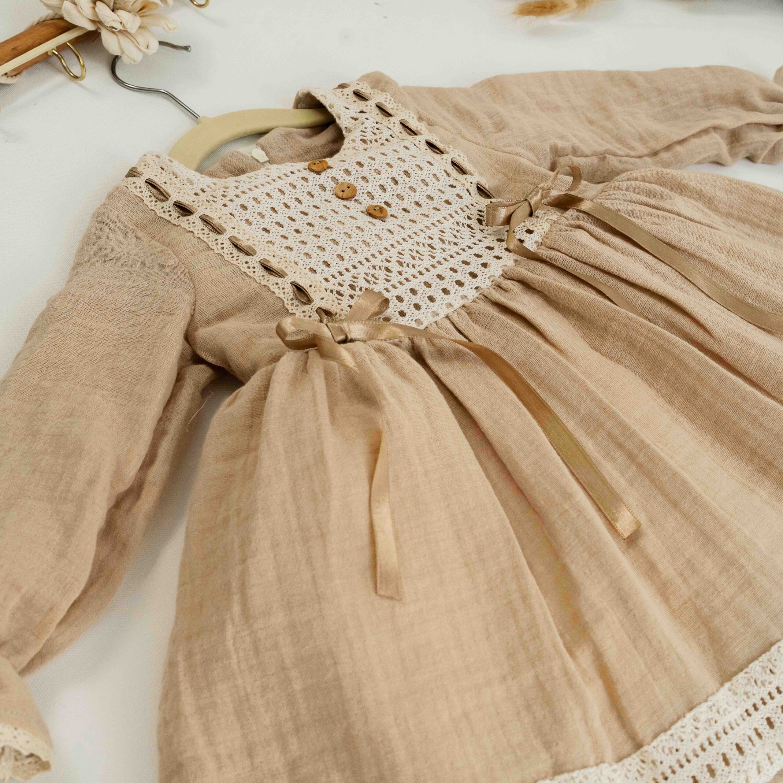 This elegant and vintage-inspired baby dress is designed for timeless charm and comfort. Crafted from a soft, breathable cotton-linen blend, the dress features a delicate crochet lace panel on the bodice with wooden button details for a rustic touch. The long puffed sleeves with ruffled cuffs add a graceful appeal, while the waist is cinched with subtle ribbon ties for an adjustable fit. The skirt flows gently, adorned with a crochet lace hem for a classic finish.