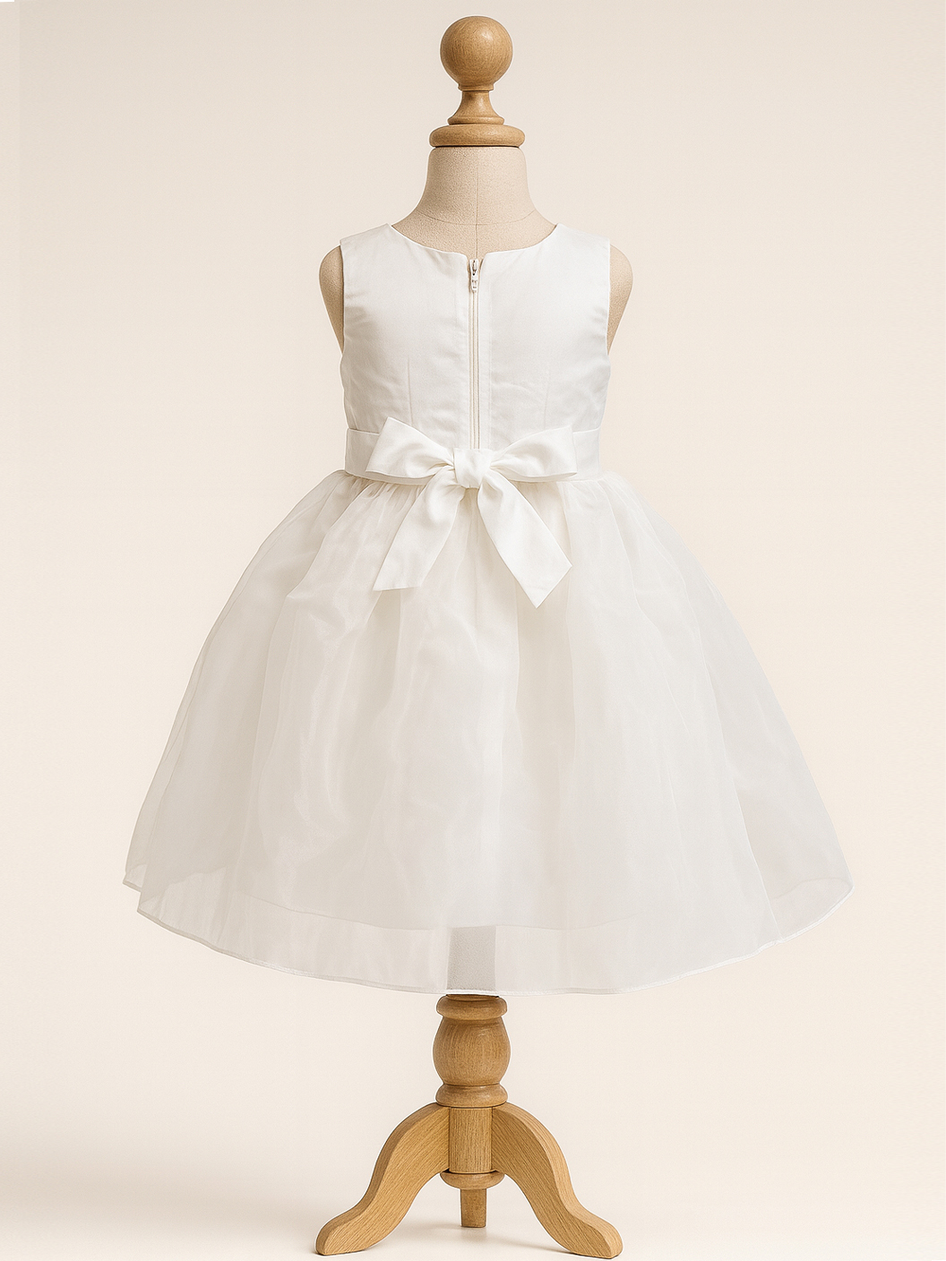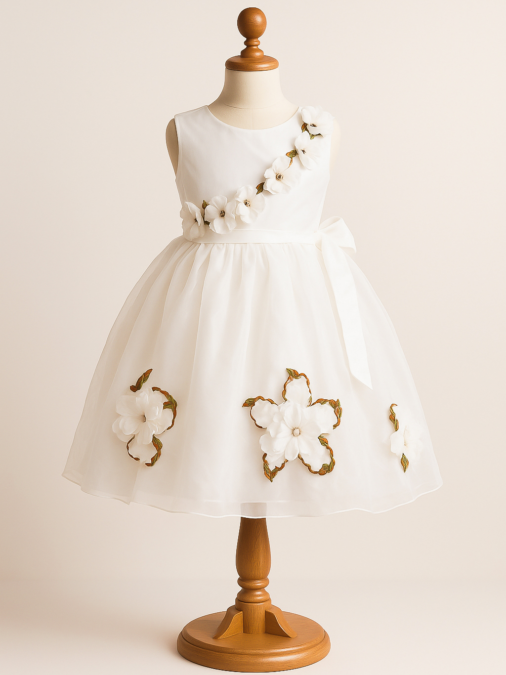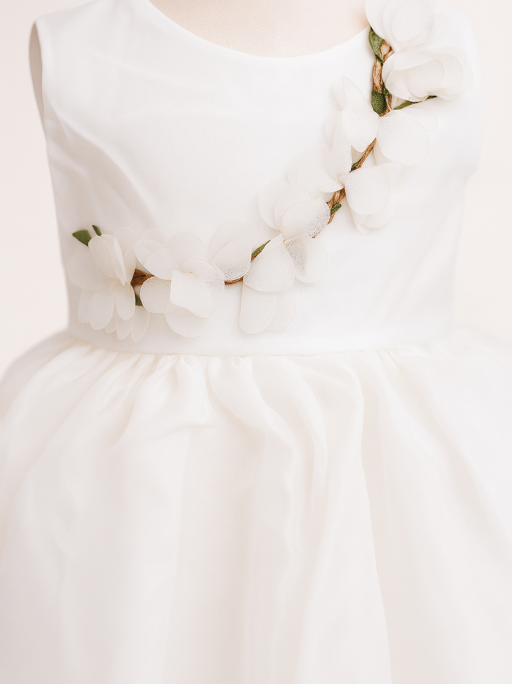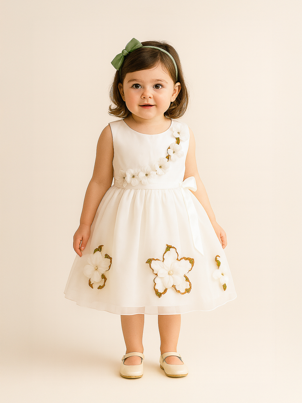 Add timeless elegance to your little princess’s wardrobe with this gorgeous white party dress. Featuring delicate 3D floral appliques across the bodice and skirt, this dress is designed to make every occasion extra special. The sleeveless cut ensures comfort, while the satin waist tie adds a perfect finishing touch. Ideal for birthdays, weddings, christenings, festive events, and photoshoots.