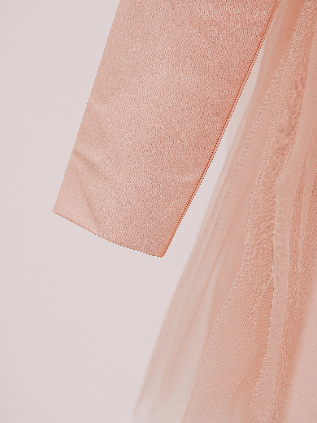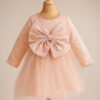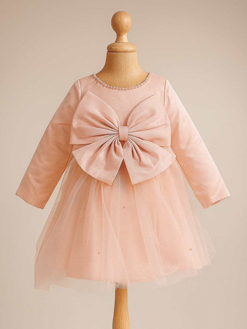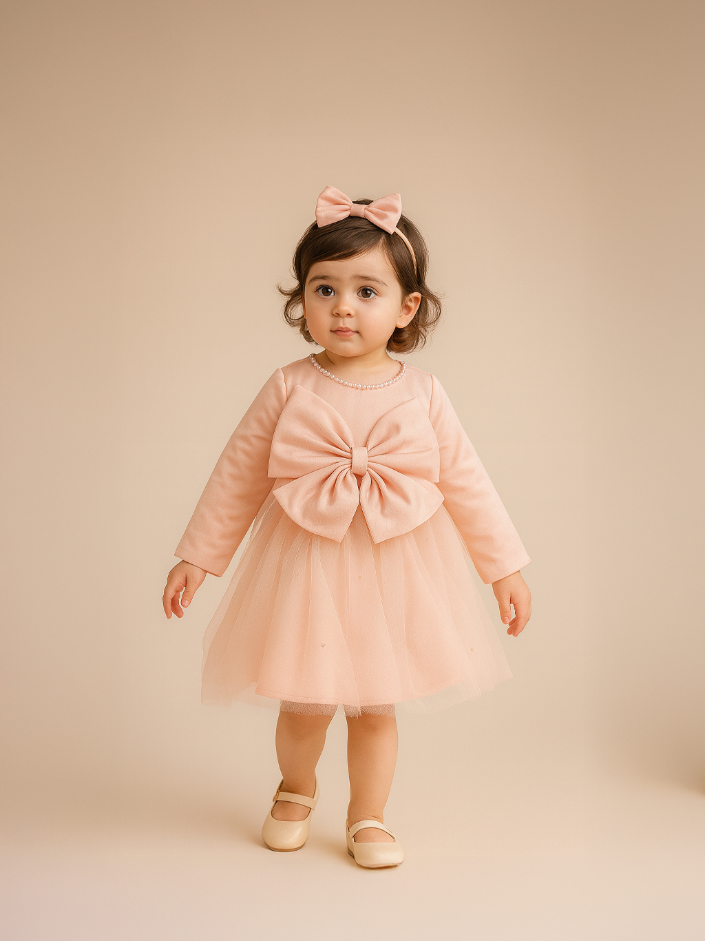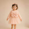 Dress your little one in charm and elegance with this adorable peach party dress. Designed with long sleeves for comfort, the dress features a stunning oversized bow at the front and a delicate pearl neckline for a touch of sophistication. The layered tulle skirt adds a fairy-tale flair, making it perfect for birthdays, family gatherings, weddings, or festive occasions.