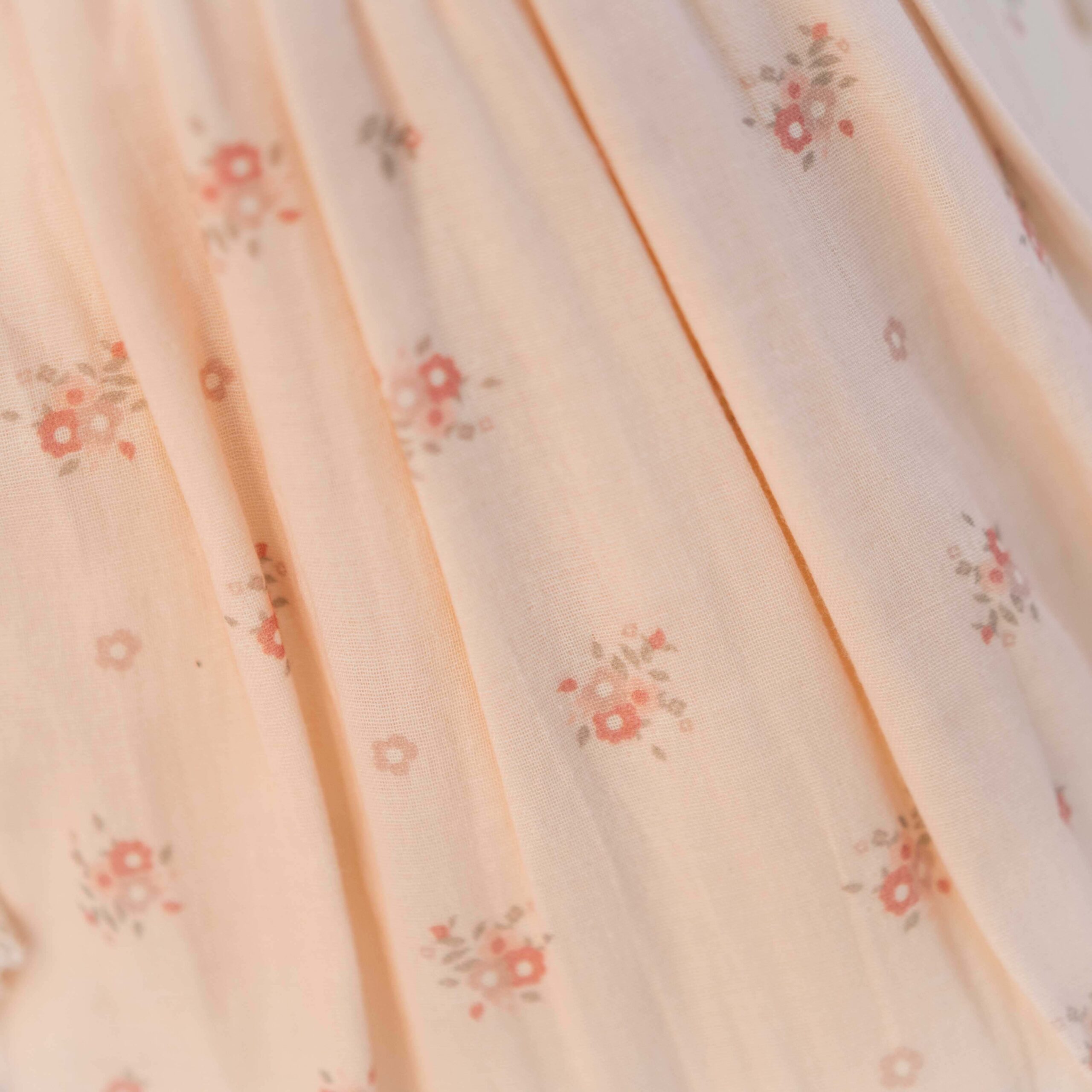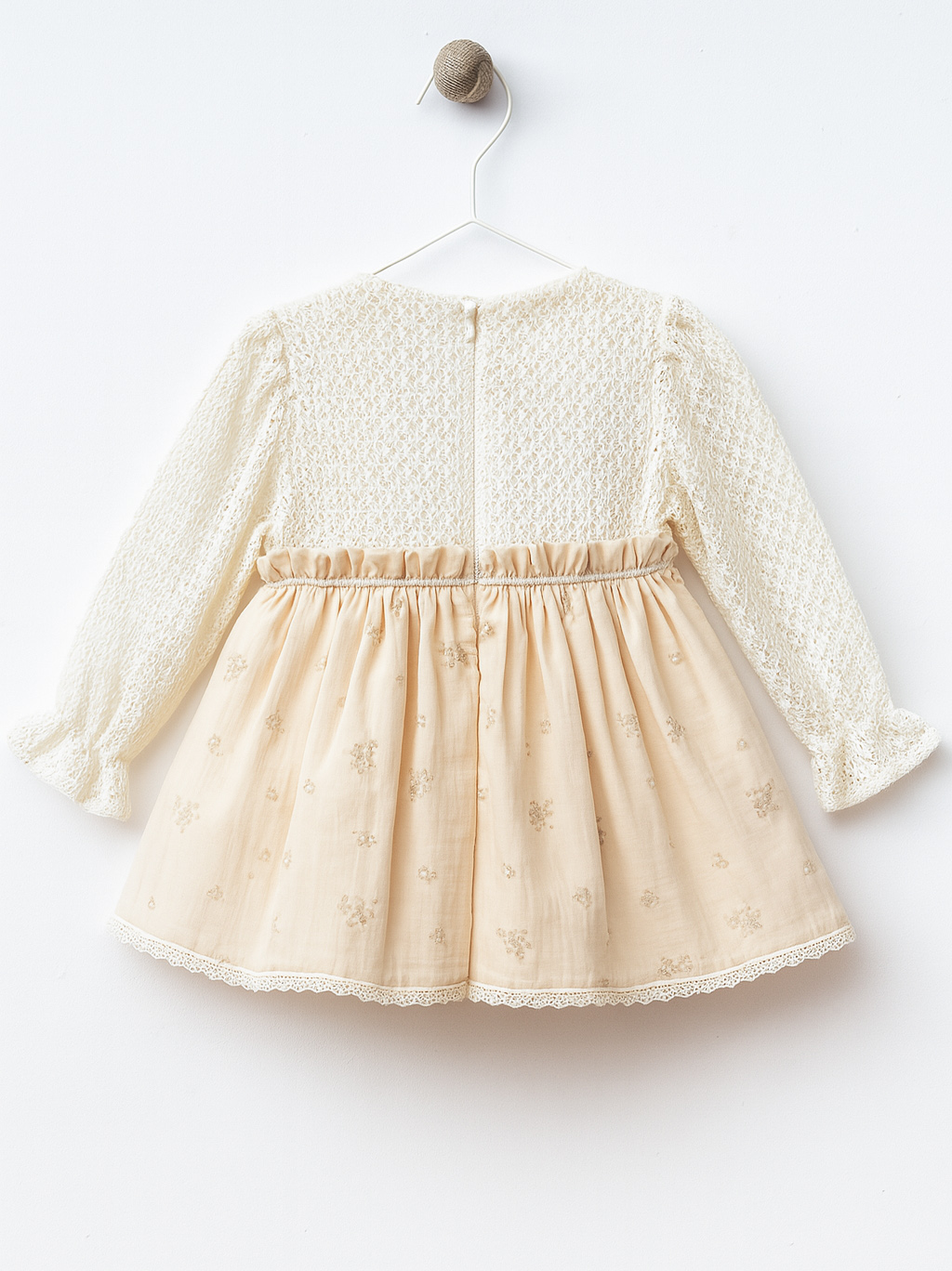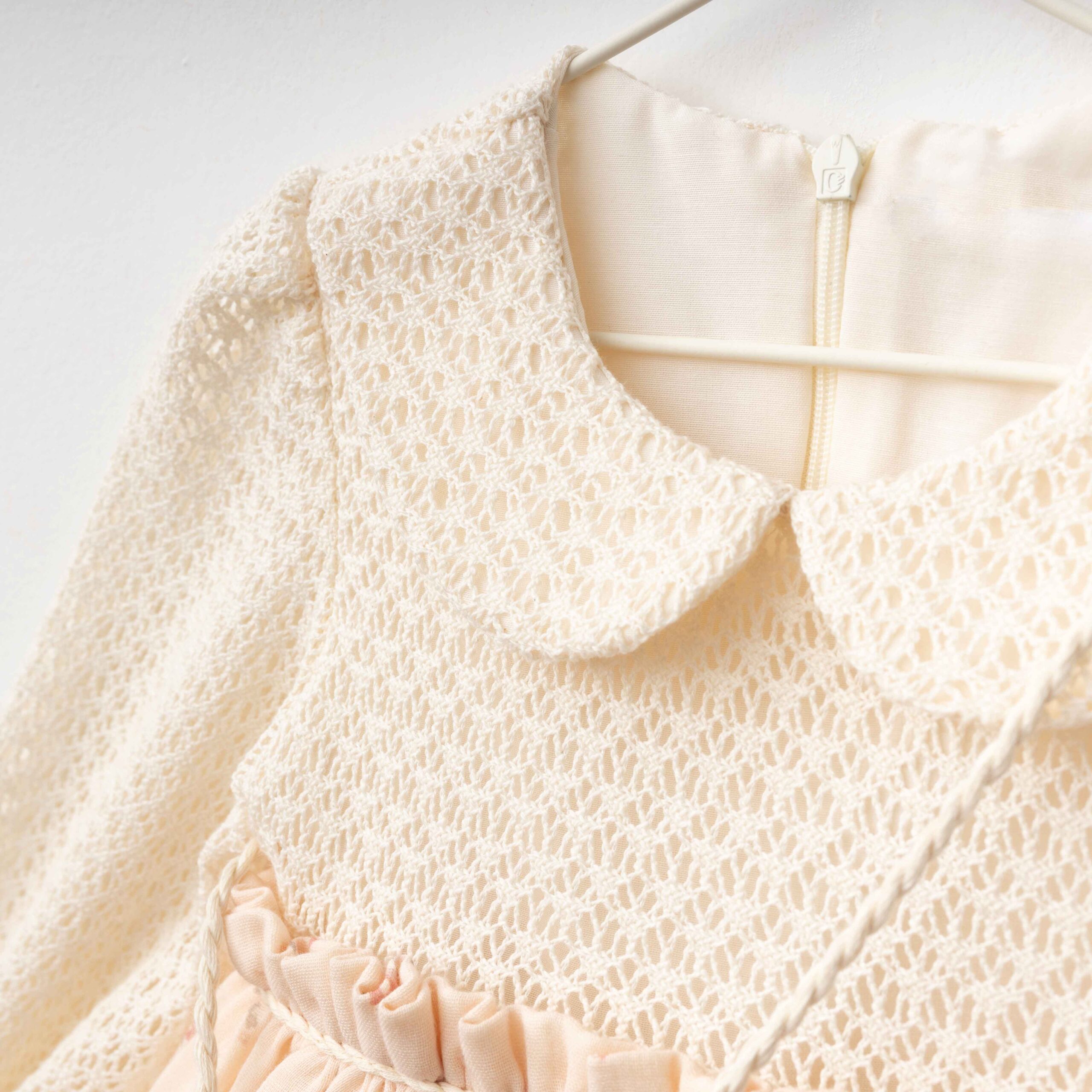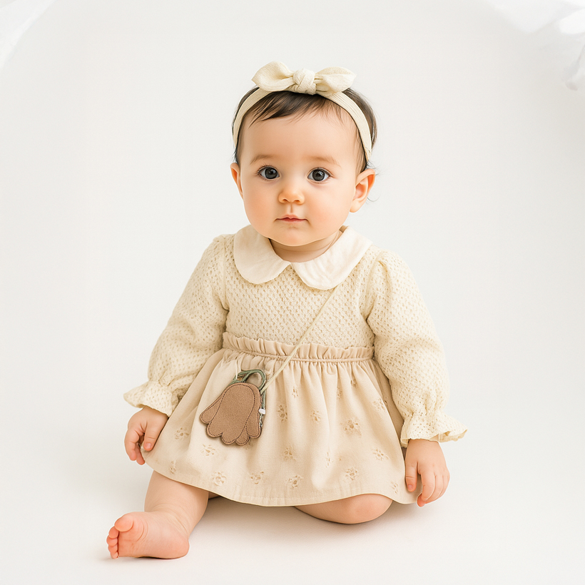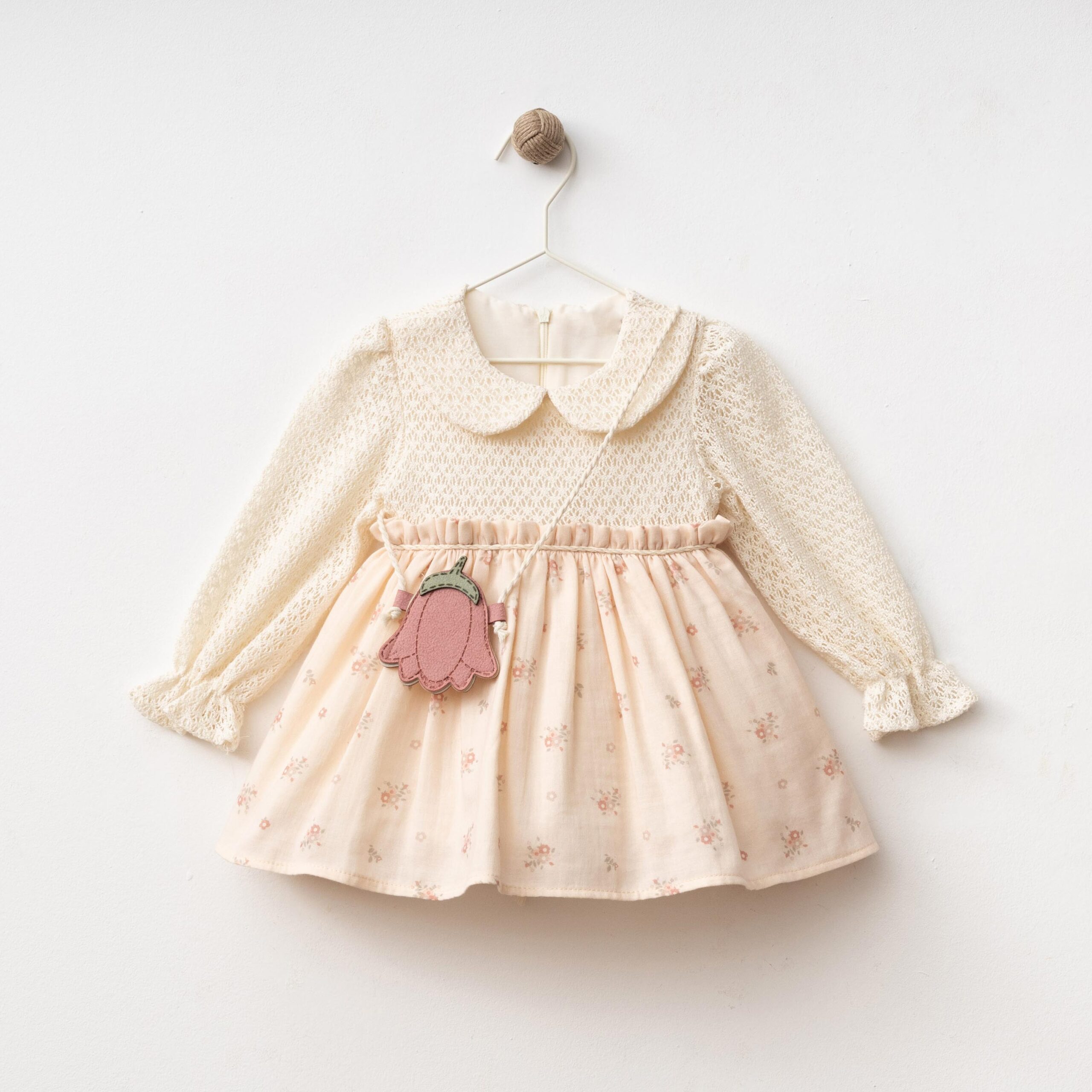 This charming baby dress combines vintage elegance with modern comfort. The upper bodice and long sleeves are crochet design, giving it a sophisticated touch, while the soft, floral-printed skirt adds a playful, breezy feel. The Peter Pan collar enhances the classic design, and a cute flower-shaped crossbody pouch adds a whimsical detail, making this dress perfect for any special occasion.