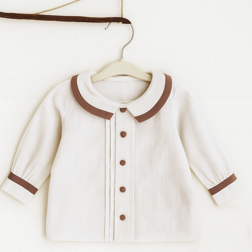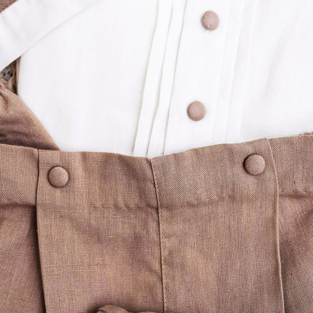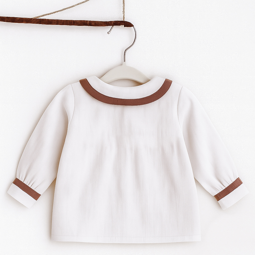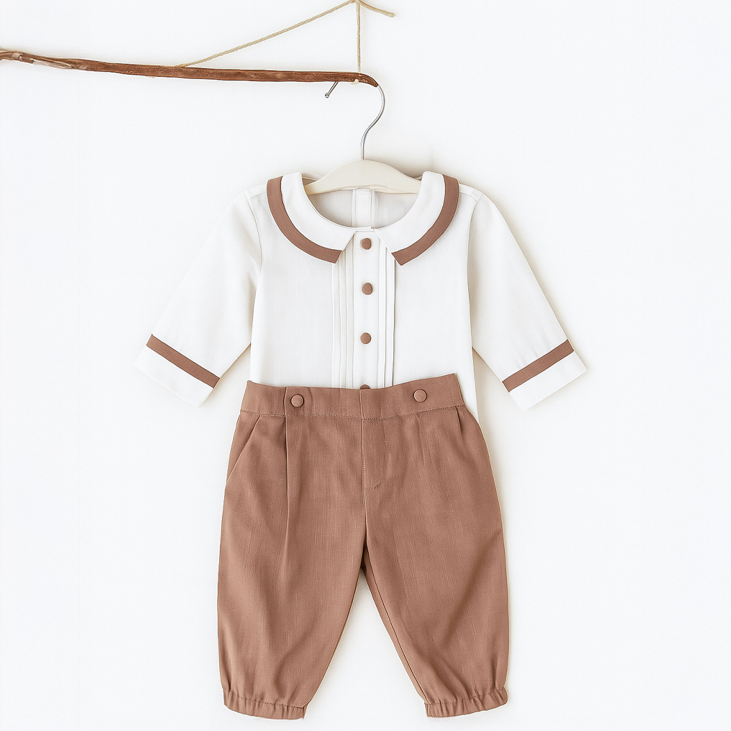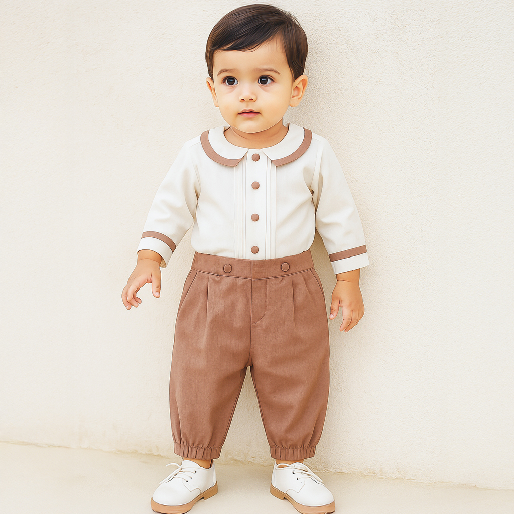 Upgrade your little one’s wardrobe with this Elegant Brown Formal Shirt & Pant Set, crafted for comfort and charm. The set includes a white full-sleeve shirt accented with brown detailing on the collar, placket, and pocket, paired with matching brown pants with hem for a refined and dapper look.