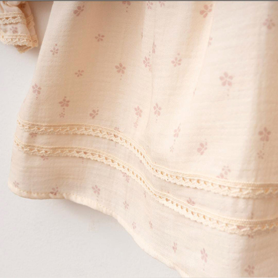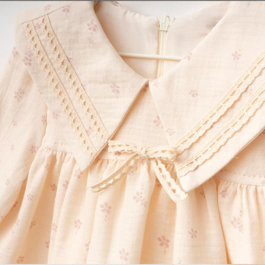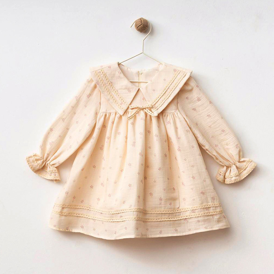 A timeless and elegant dress designed for little ones, featuring a soft cream fabric with delicate floral embroidery. This long-sleeved dress is adorned with a wide lace-trimmed sailor collar and a dainty bow at the front, adding a vintage touch. The ruffled cuffs and lace detailing along the hemline complete the charming look, making it perfect for special occasions.