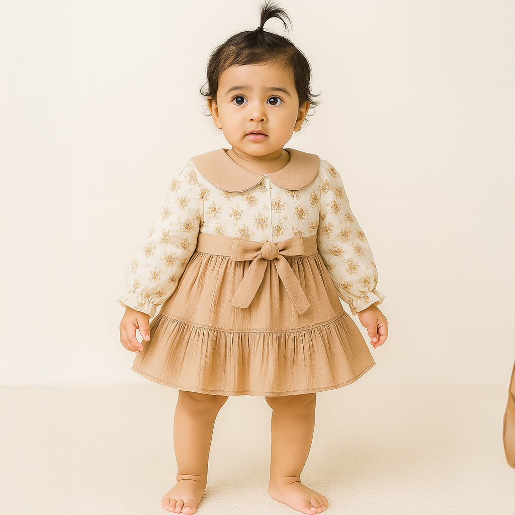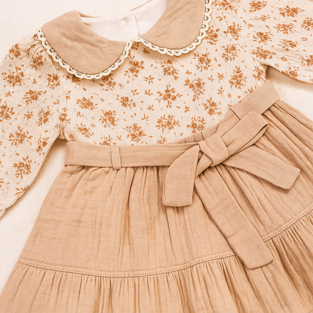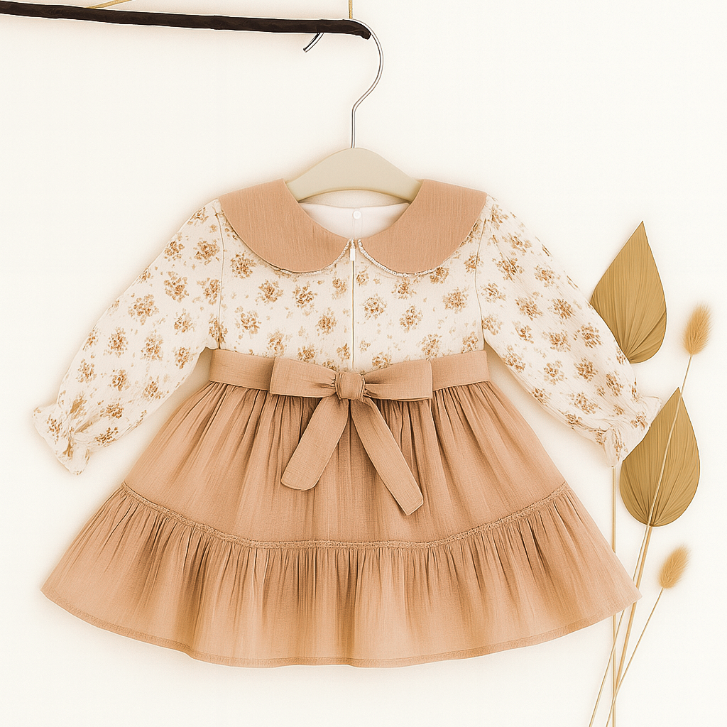 This charming baby girl dress combines vintage floral elegance with a modern touch. The top features a delicate floral print with long puffed sleeves, elasticized cuffs, and a Peter Pan collar with lace trim. The attached pleated skirt in a soft earthy tone adds a flowy, graceful appeal, complete with a stylish fabric belt that ties into a bow for a perfect finishing touch.