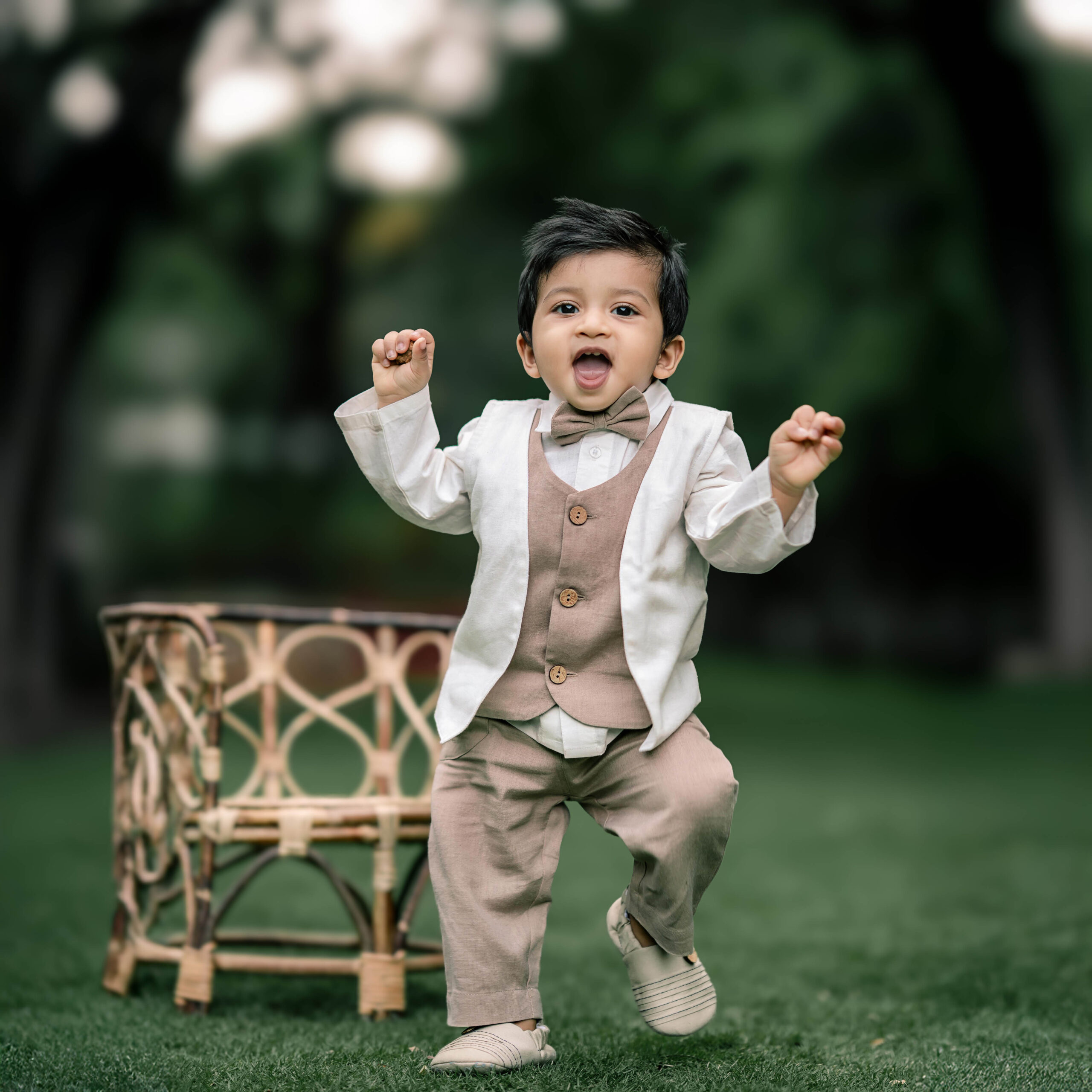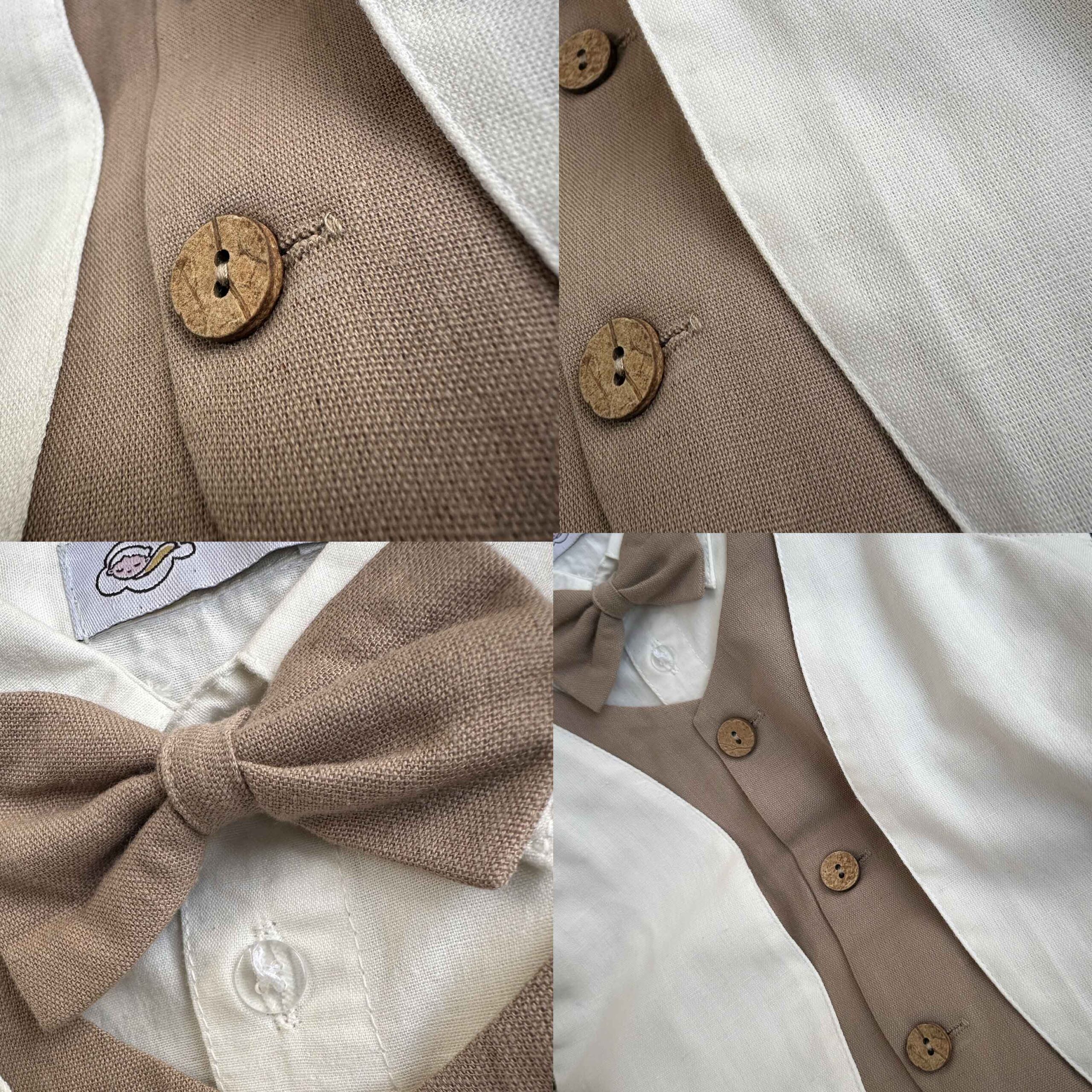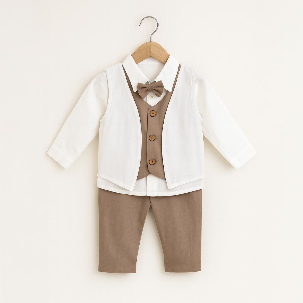 Dress your little one in timeless charm with our Baby Boys’ 3-Piece Formal Outfit Set. This adorable ensemble includes a crisp white blazer, a light brown/beige waistcoat with wooden buttons, and matching trousers – all crafted from soft, breathable cotton-linen blend fabric to ensure comfort and style.