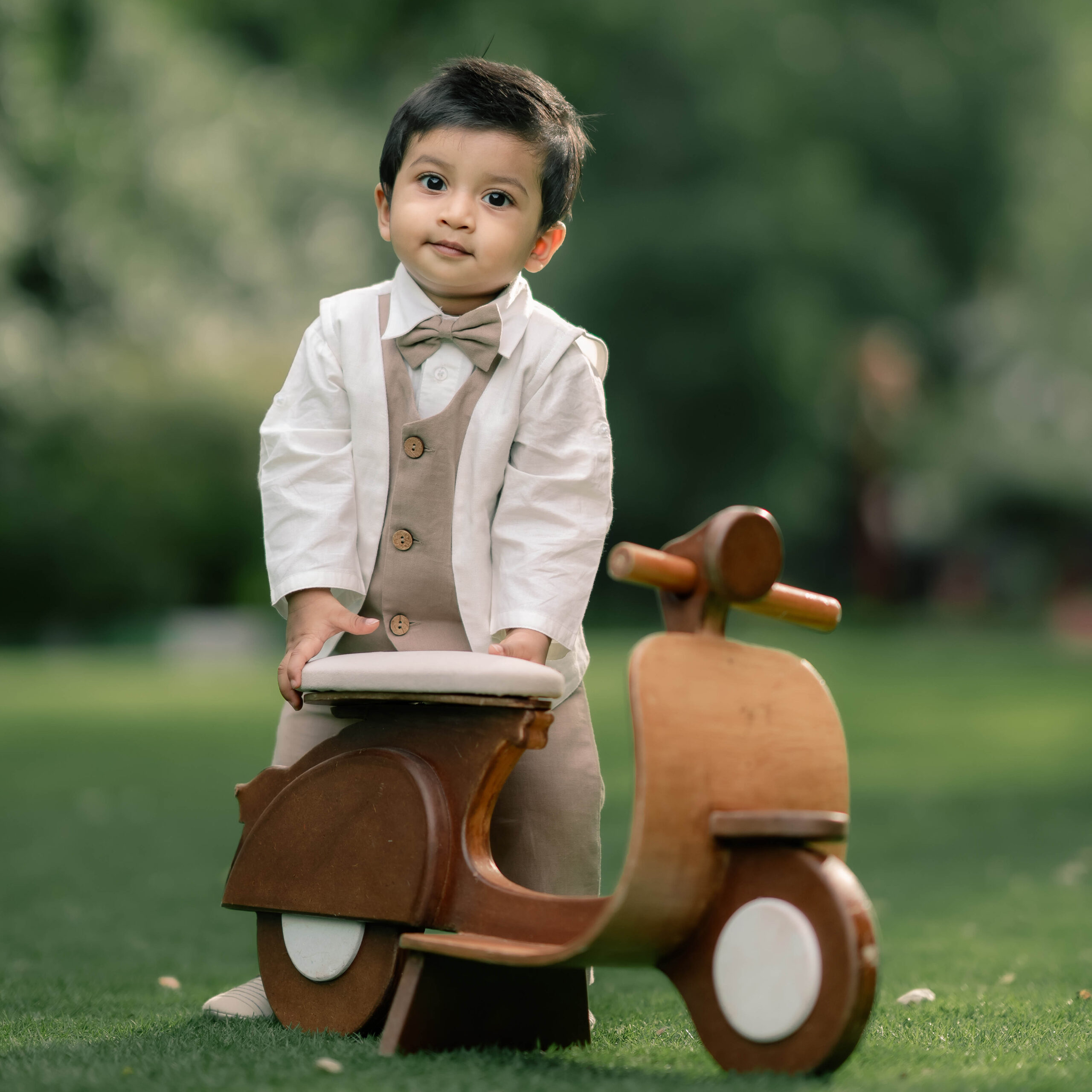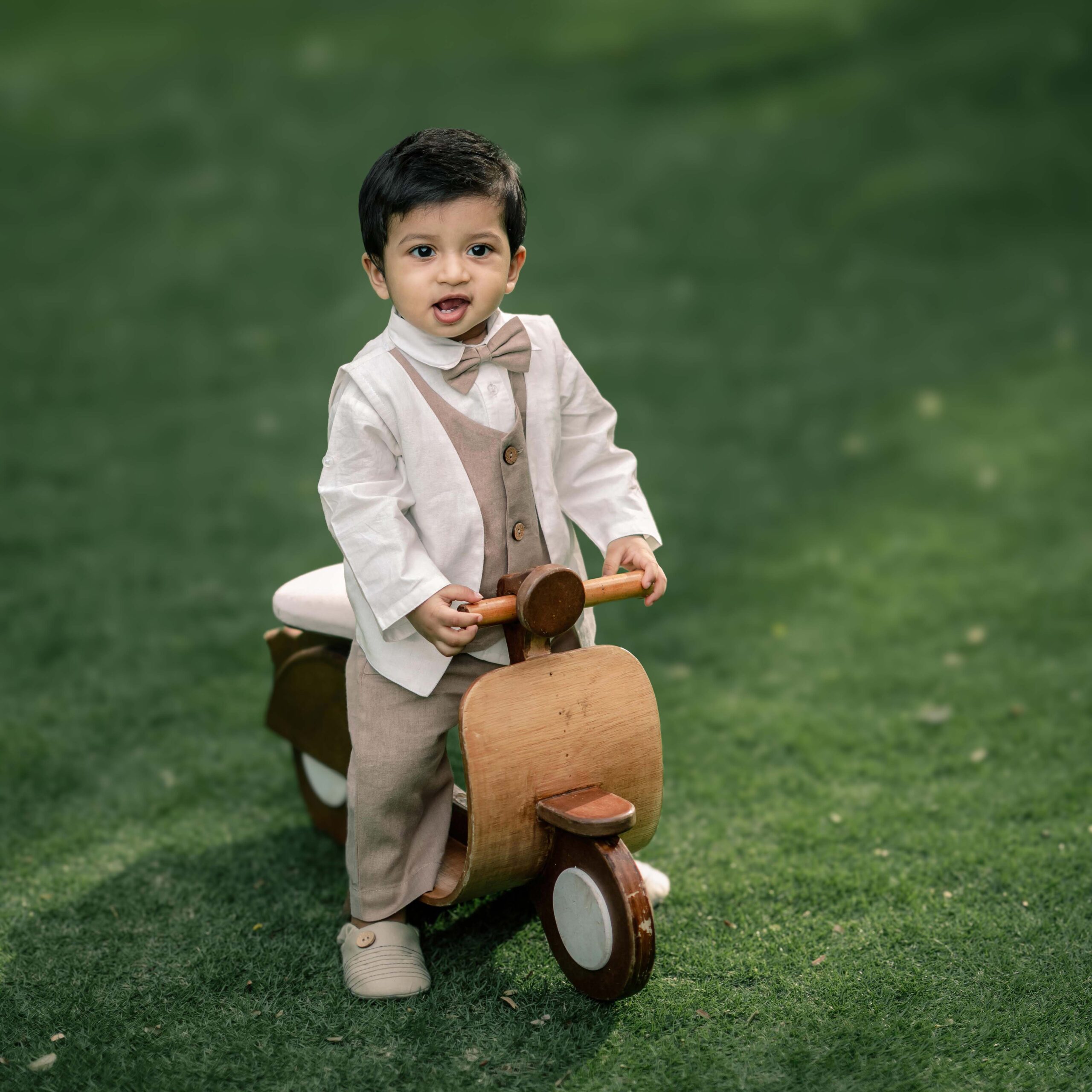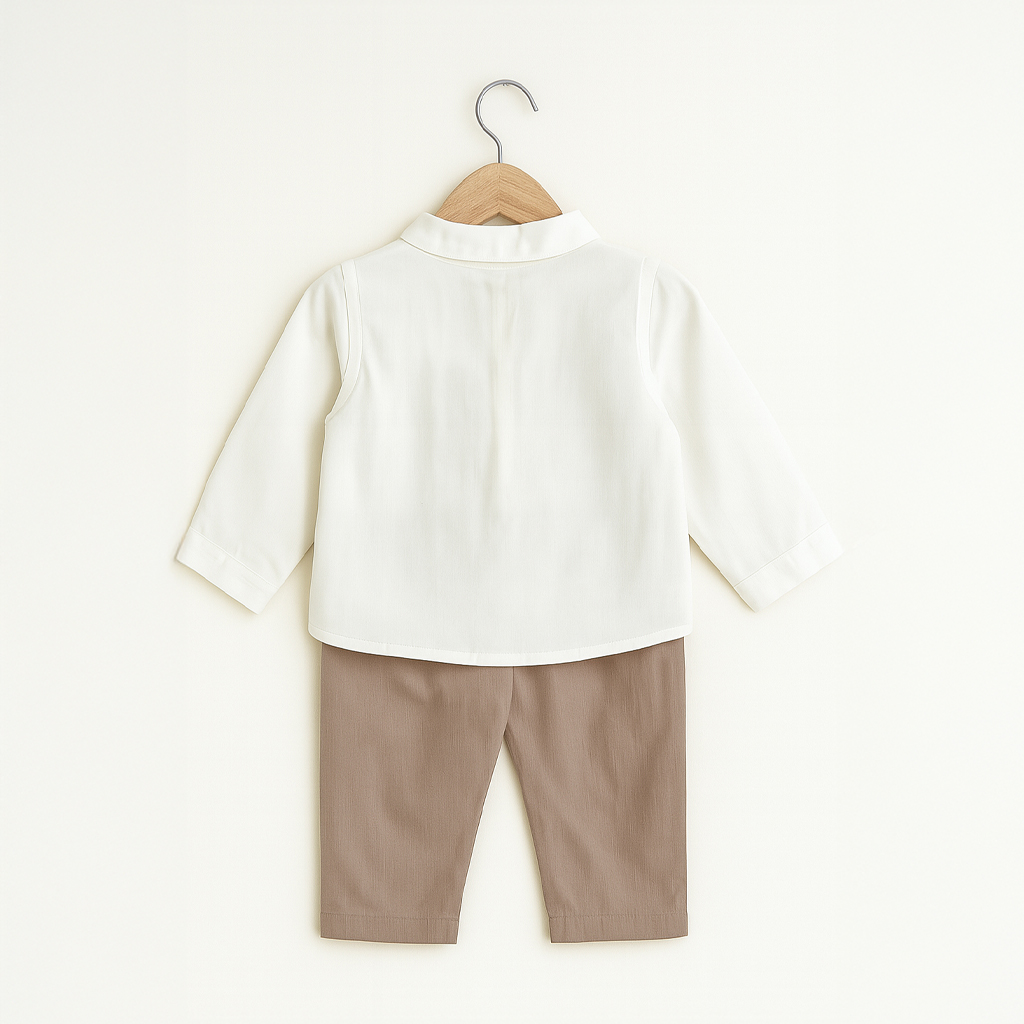 Dress your little one in timeless charm with our Baby Boys’ 3-Piece Formal Outfit Set. This adorable ensemble includes a crisp white blazer, a light brown/beige waistcoat with wooden buttons, and matching trousers – all crafted from soft, breathable cotton-linen blend fabric to ensure comfort and style.