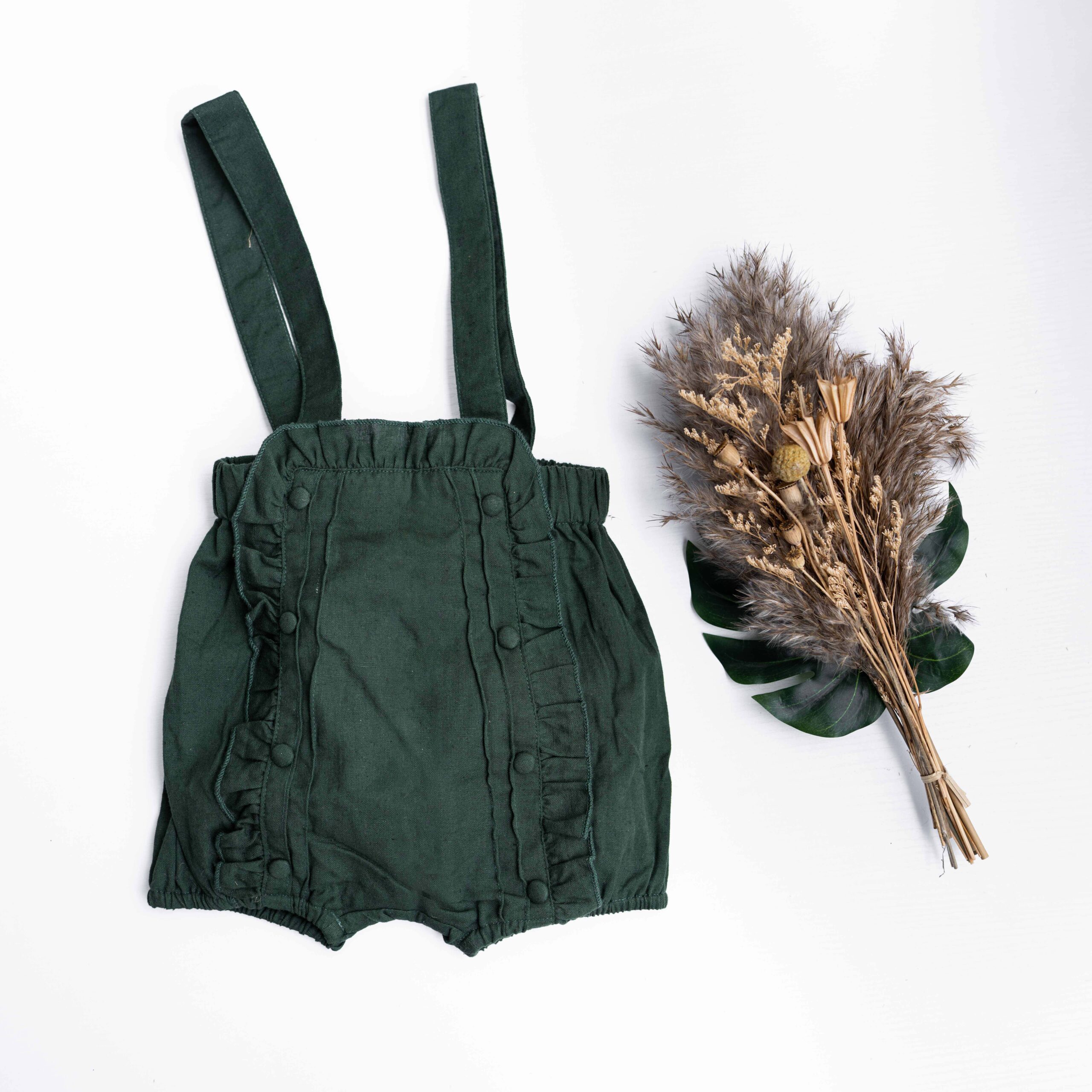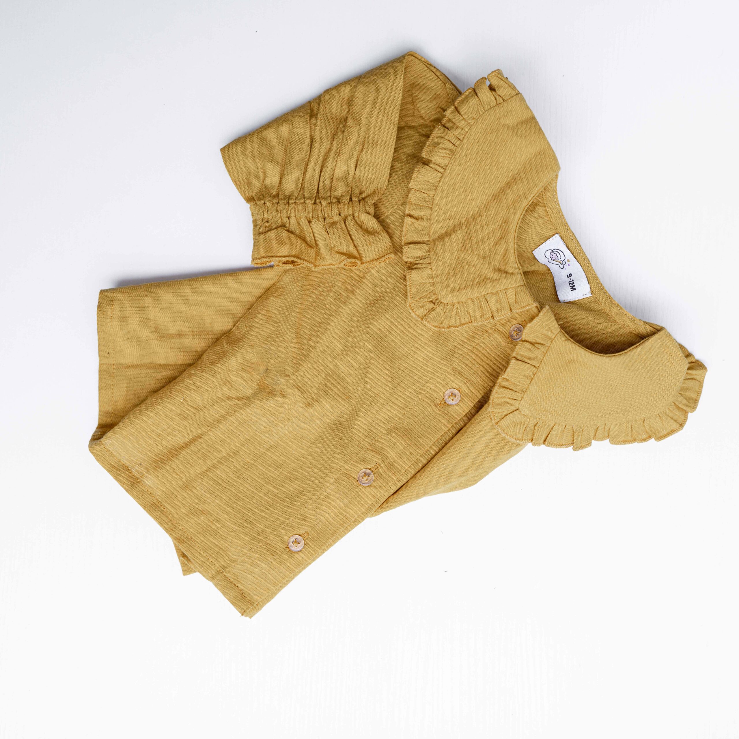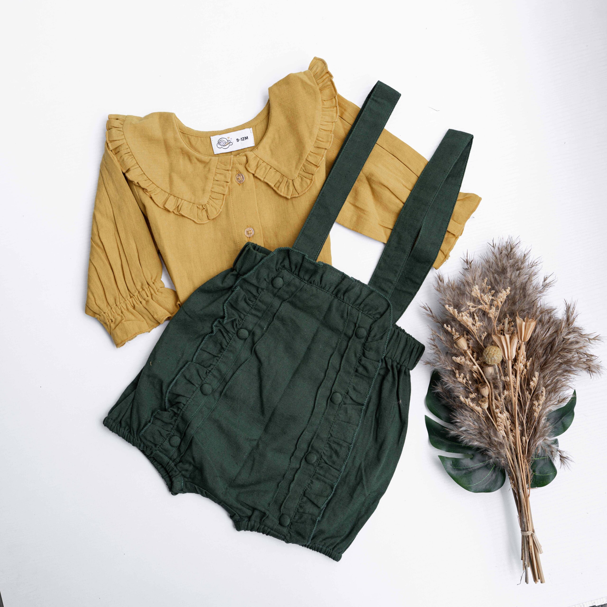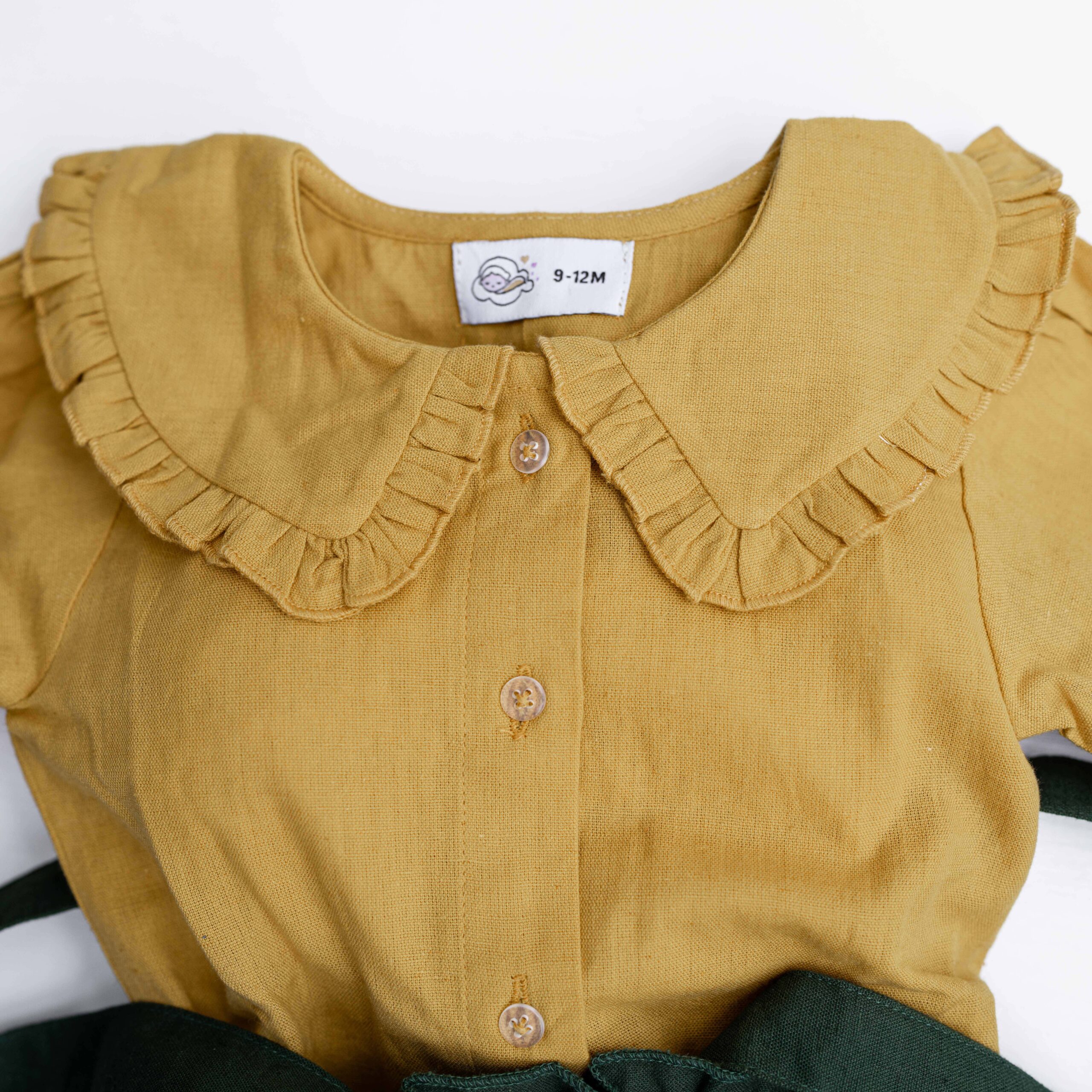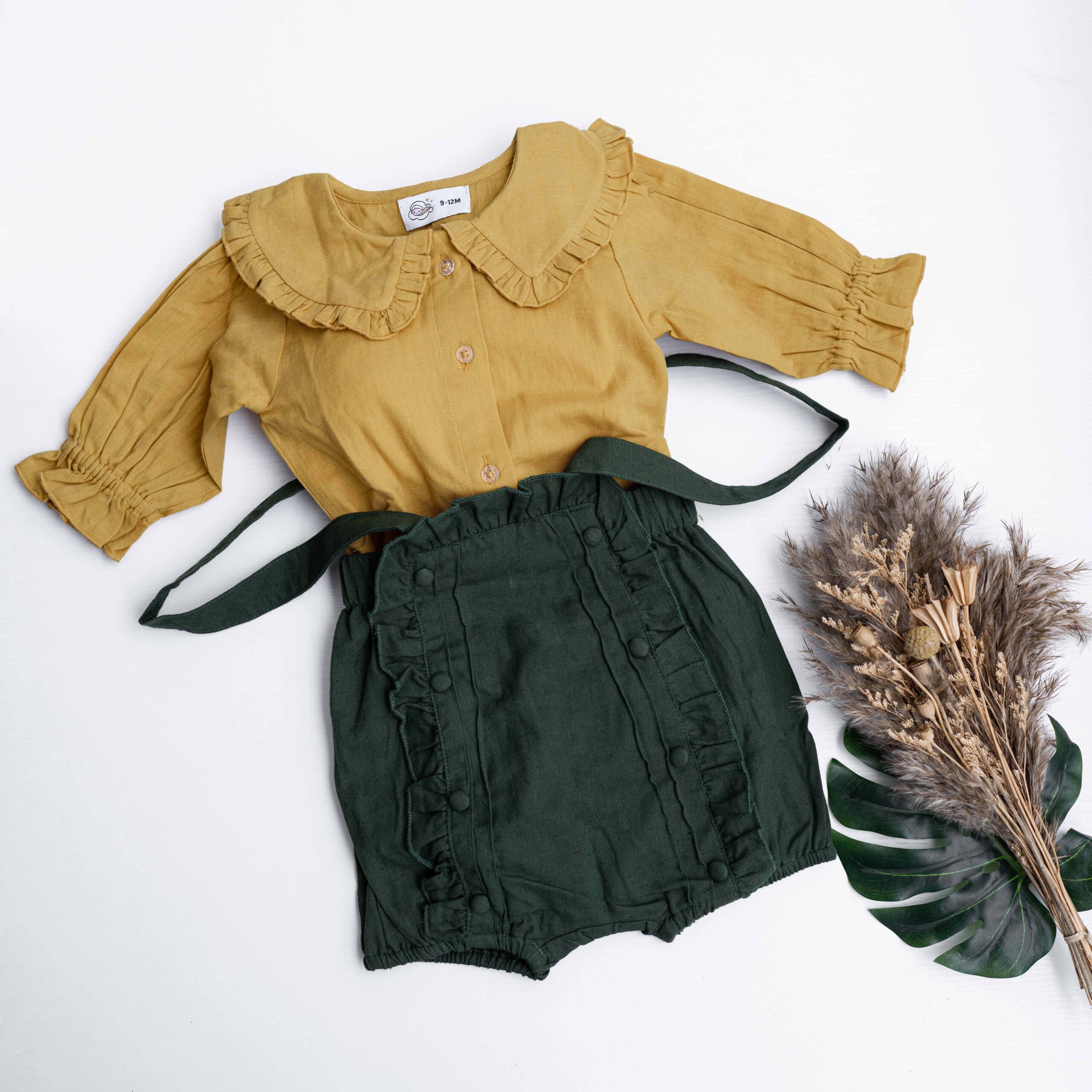 Bring charm and elegance to your baby’s wardrobe with our 2-piece Organic Cotton Pinafore Set. Featuring a stylish mustard yellow ruffle collar top paired with dark green suspender-style shorts, this outfit is a perfect blend of comfort and vintage-inspired fashion.