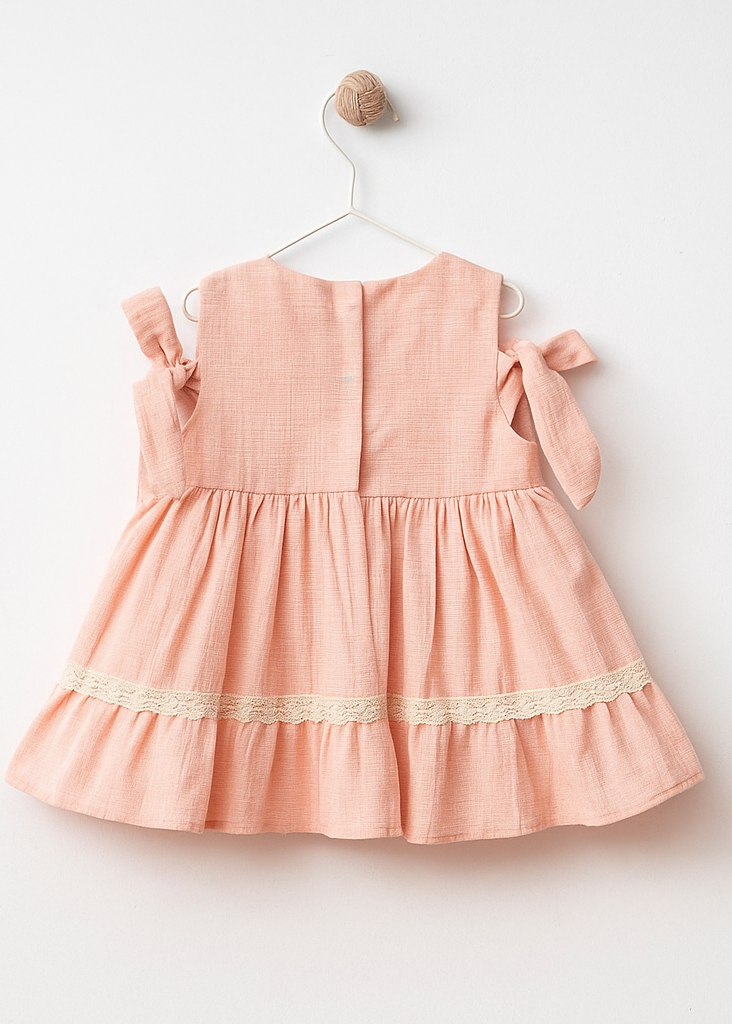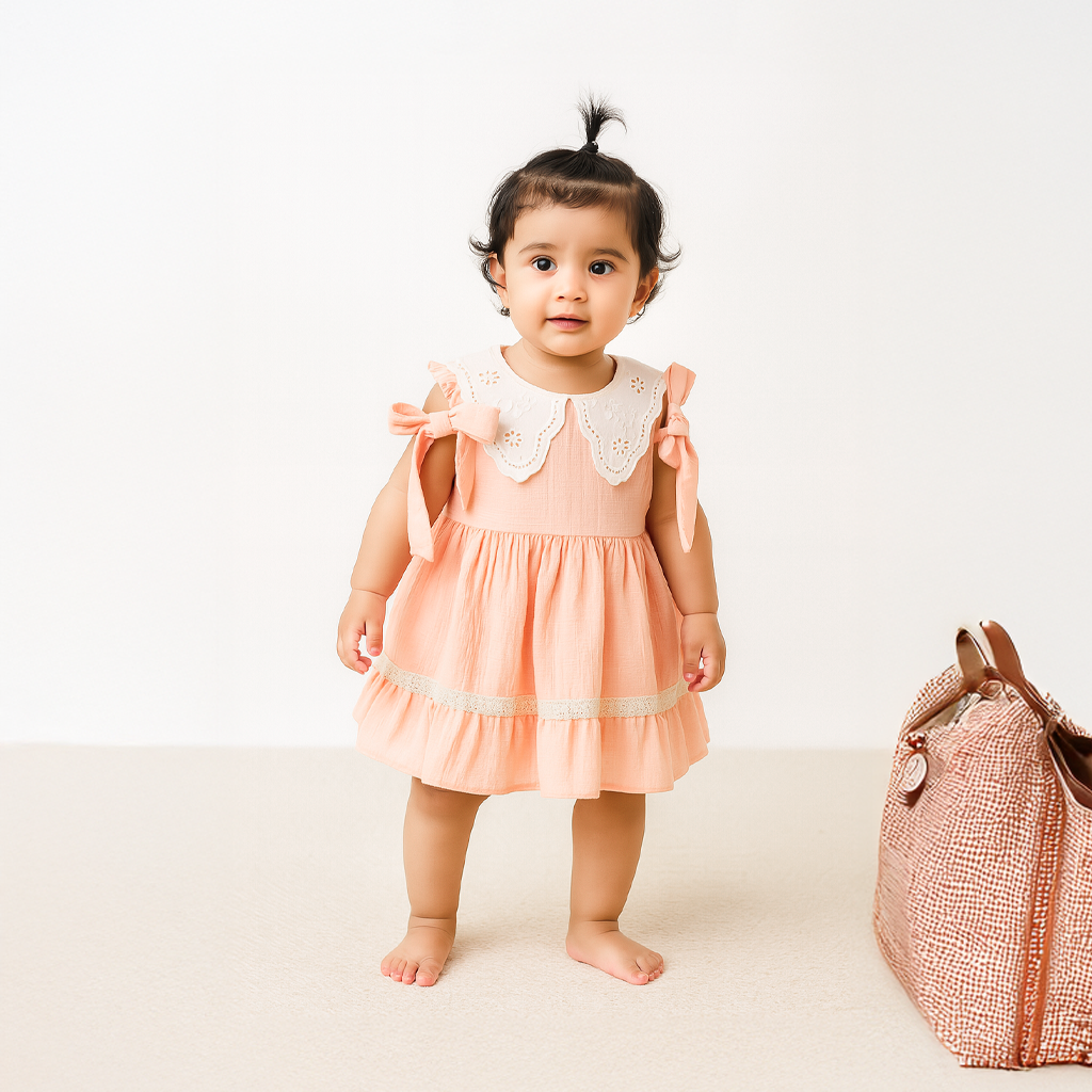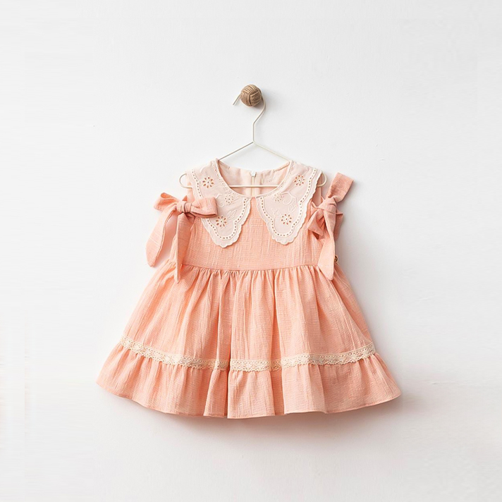 This charming vintage-style baby girl dress is designed with a timeless, elegant touch. Made from soft, textured fabric in a warm beige hue, it offers comfort and style for any special occasion or daily wear. Featuring delicate ruffle details, an embroidered Peter Pan collar, and a flowy silhouette, this dress is perfect for your little one’s wardrobe.