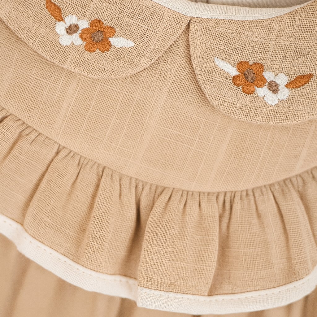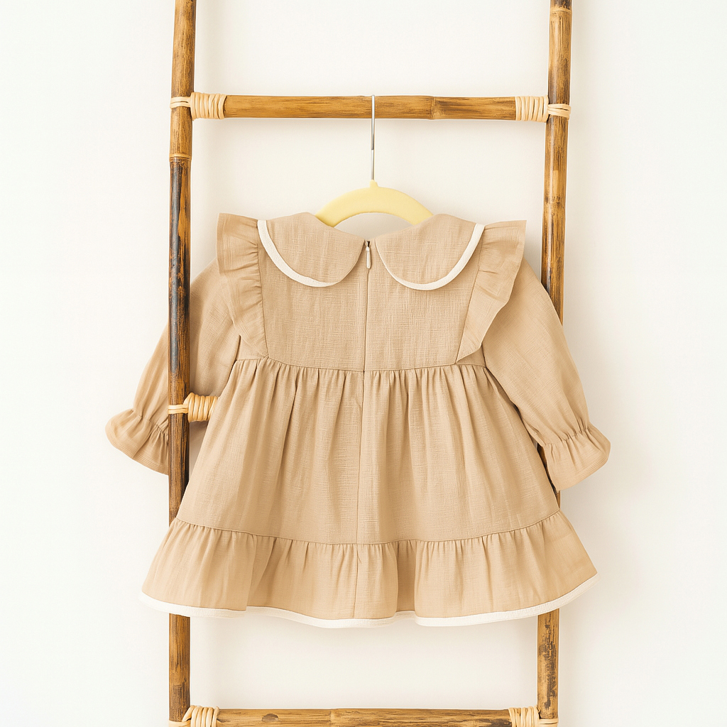 This charming vintage-style baby girl dress is designed with a timeless, elegant touch. Made from soft, textured fabric in a warm beige hue, it offers comfort and style for any special occasion or daily wear. Featuring delicate ruffle details, an embroidered Peter Pan collar, and a flowy silhouette, this dress is perfect for your little one’s wardrobe.