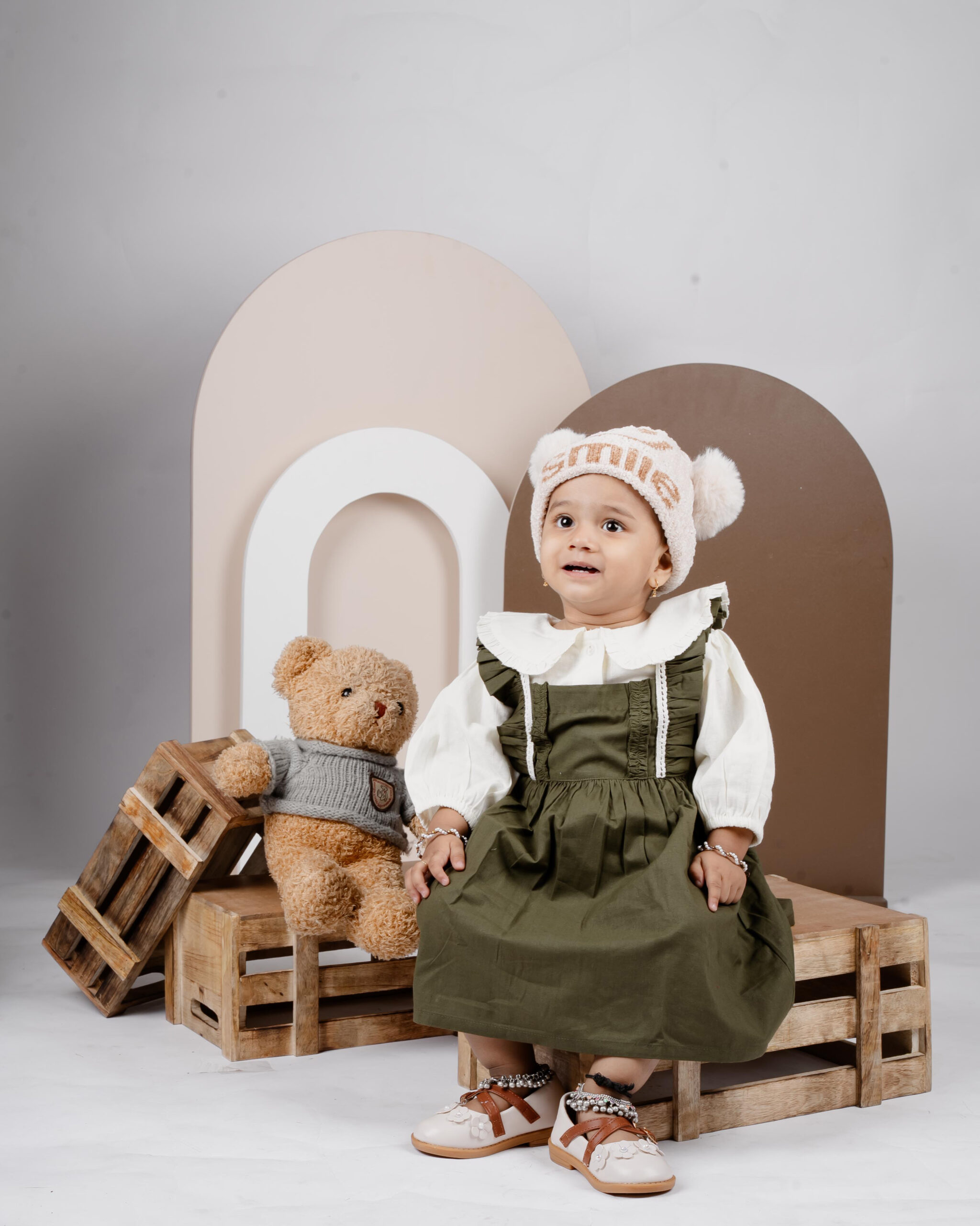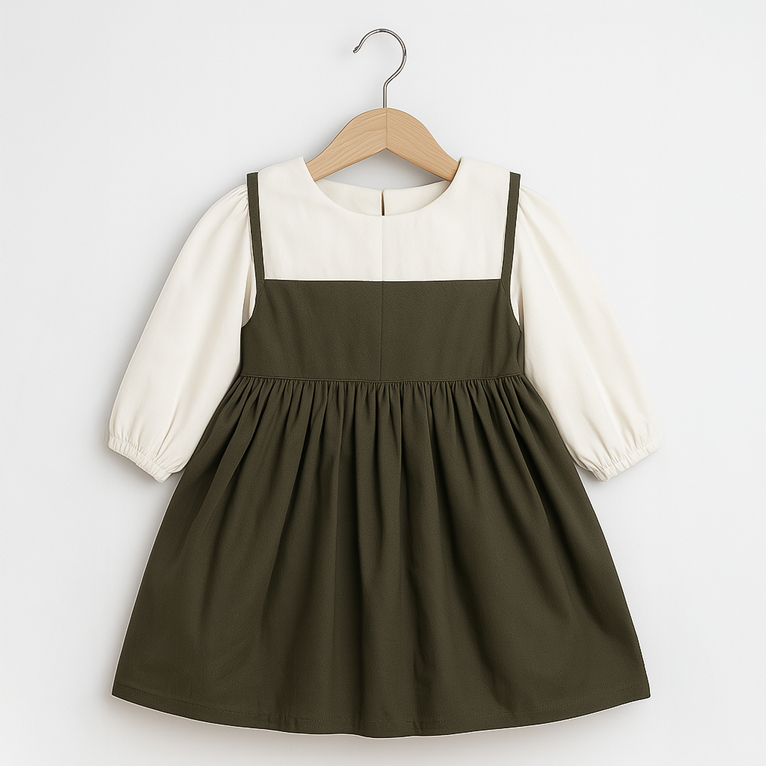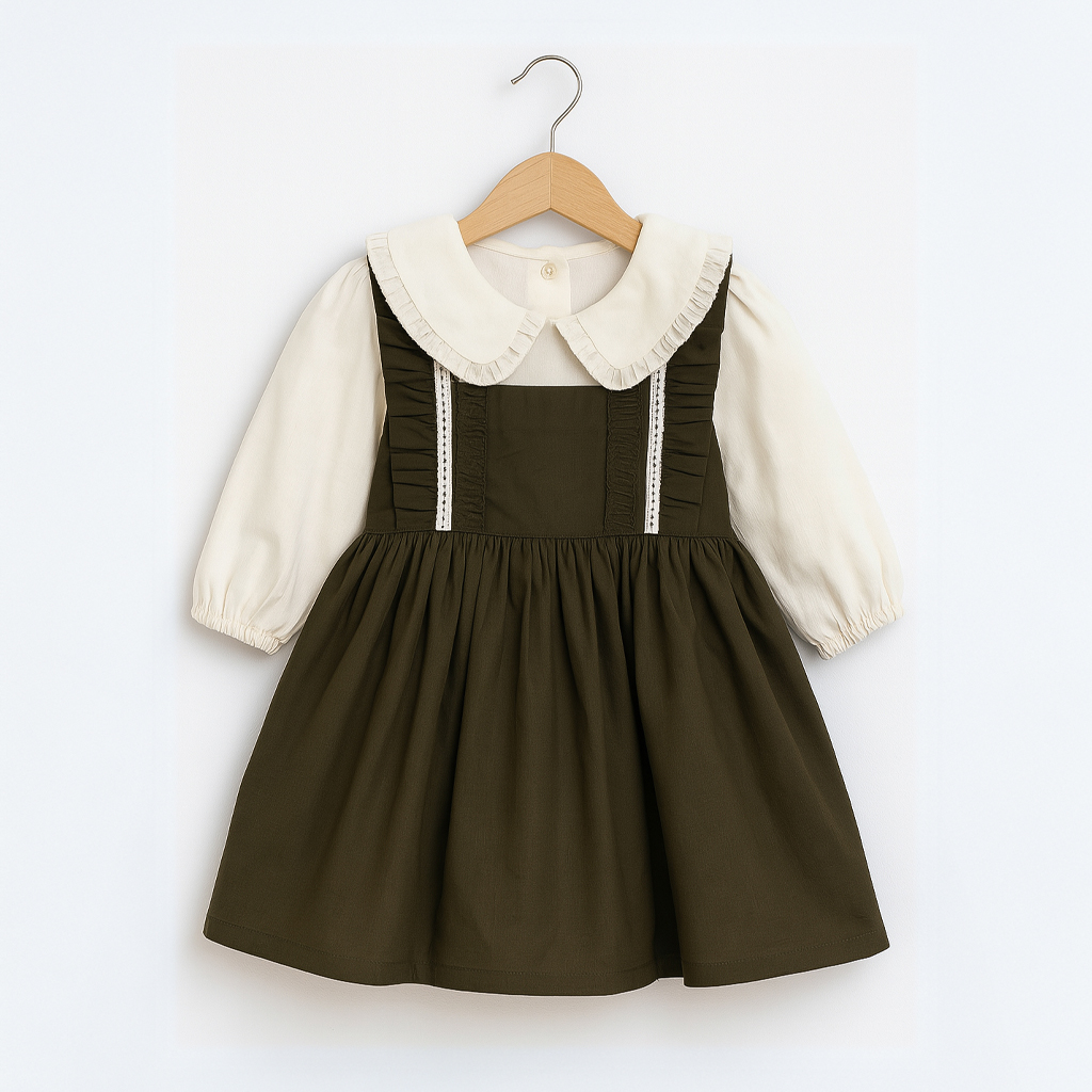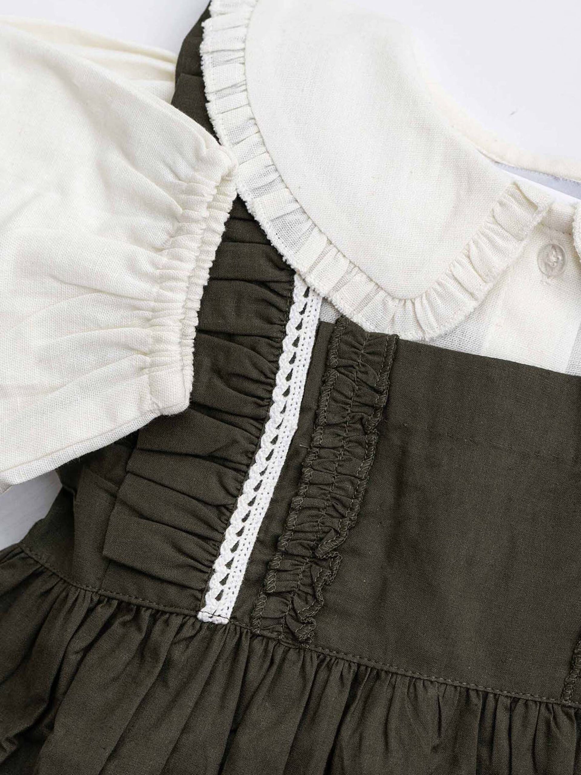 Refined and timeless, this olive green pinafore dress is a graceful blend of vintage charm and modern comfort. Made from 100% organic cotton, it’s designed with a fitted bodice featuring delicate ruffle trim and lace detailing along the front. The soft gathered skirt offers gentle volume and flow, making it perfect for all-day wear.